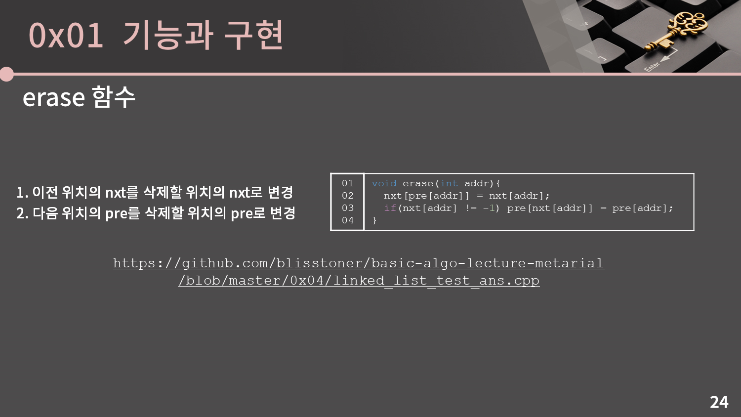 다음으로 erase 함수를 설명드리겠습니다. 그 전에 insert 함수를 익힌 것을 바탕으로 erase 함수는 직접 짜보겠다! 뭐 이런 자세 정말 좋습니다. 한 번 시도해보면 좋습니다.