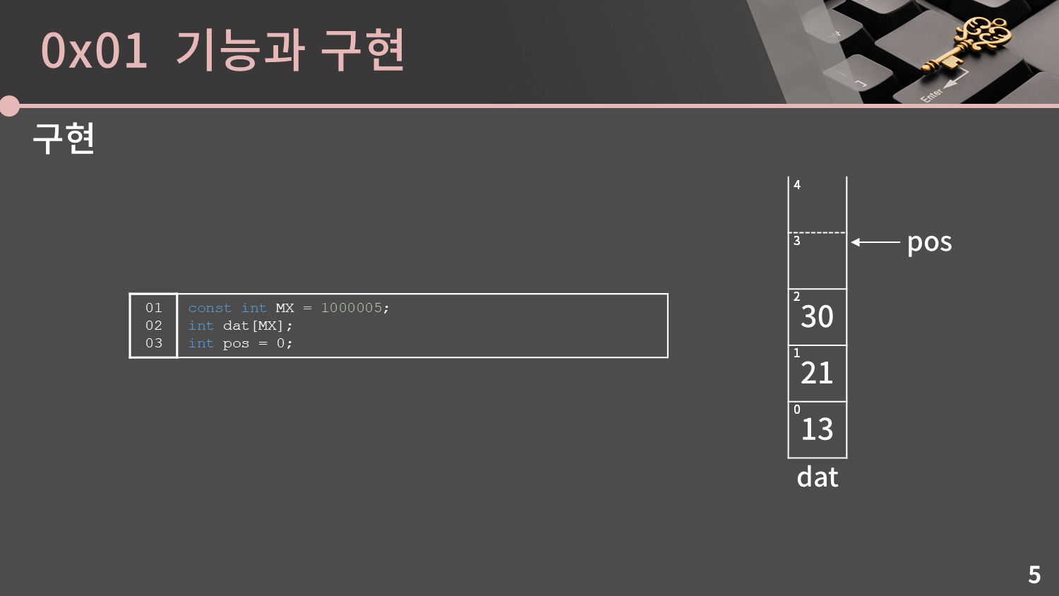 {13, 21, 30}이 담겨있는 스택을 나타내기 위해 dat[0], dat[1], dat[2] 각각에 13, 21, 30을 썼고 pos는 3이라는 값을 가집니다. 이와 같이 스택의 값들은 dat의 0번지부터 저장되고 pos는 다음에 원소가 추가될 때 삽입해야하는 곳을 가리키고 있습니다. 그리고 잘 생각해보면 pos의 값이 곧 스택의 길이, 즉 스택 내의 원소의 수를 의미한다는 것을 알 수 있습니다.