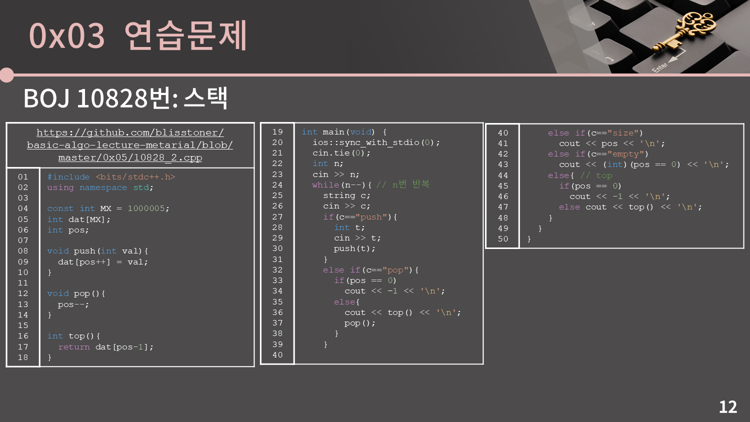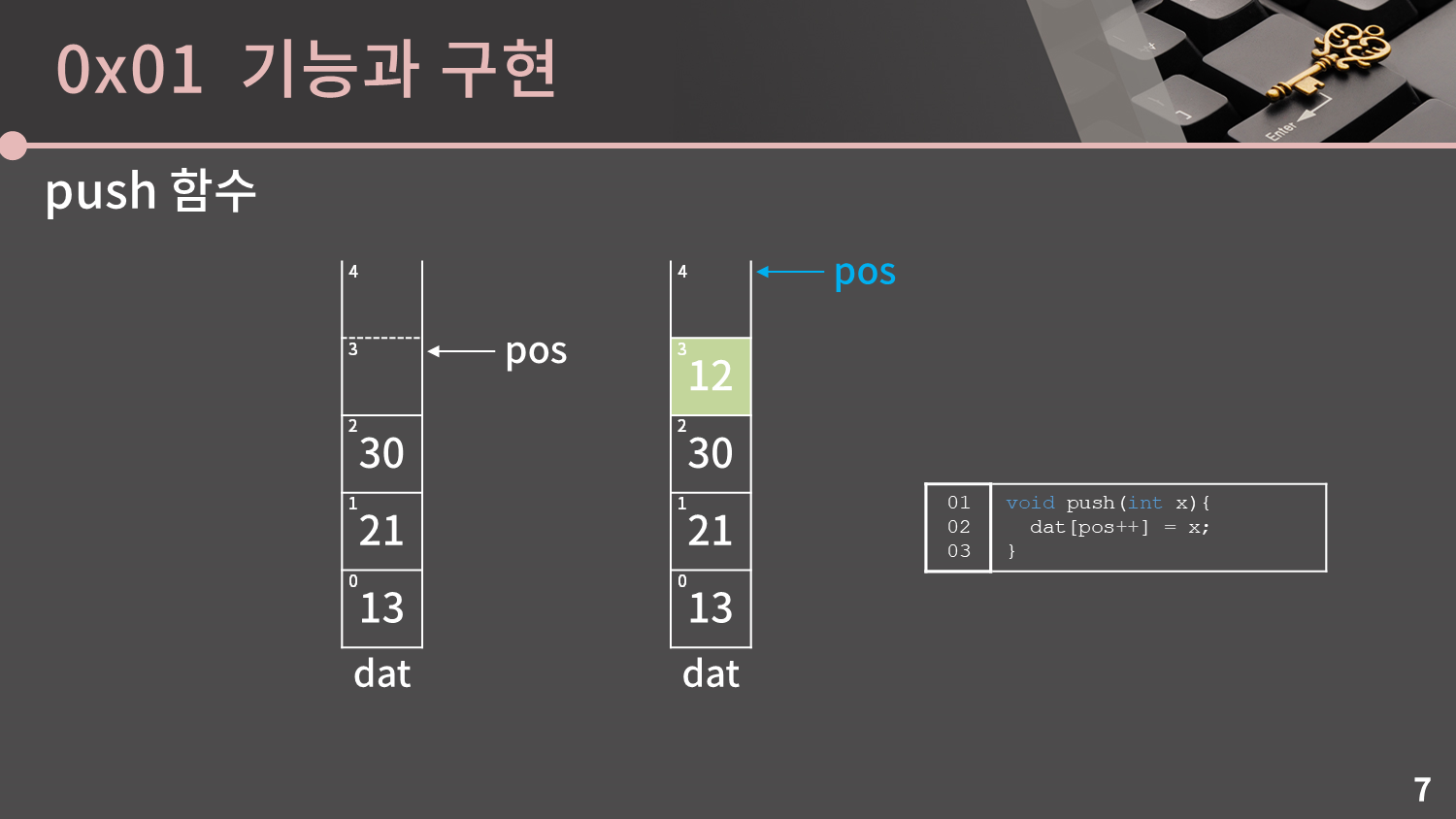 그 다음으로는 꼭대기에 있는 12를 빼보겠습니다. 12를 빼려면 딱 1개만 하면 되는데 그냥 pos를 1 줄이면 됩니다. 이 때 dat의 3번지에 있는 값 12 자체는 굳이 변경하지 않아도 괜찮습니다. 왜냐하면 나중에 push가 발생하면 어차피 그 때 들어올 값으로 덮어써질거라 더 이상 저 12라는 값은 아무 의미가 없고, 이런 상황이면 굳이 값을 변경하는 추가적인 연산을 하는게 시간낭비니 내버려두면 될 것입니다. 이를 코드로 표현하면 pos--; 입니다.