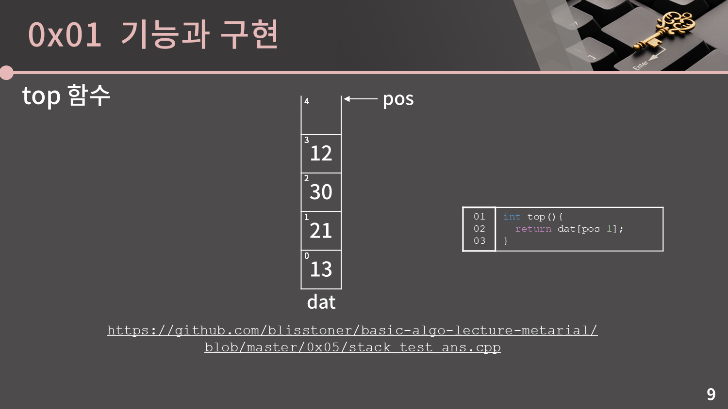 제일 위의 원소를 확인하는 top 함수는 더욱 더 날먹일 것 같은데, 지금 이런 상황에서 12를 반환하고 싶으면 진짜 그냥 dat[pos-1]만 반환하면 끝입니다. 코드도 뭐 곧이곧대로 옮기면 끝이죠.
