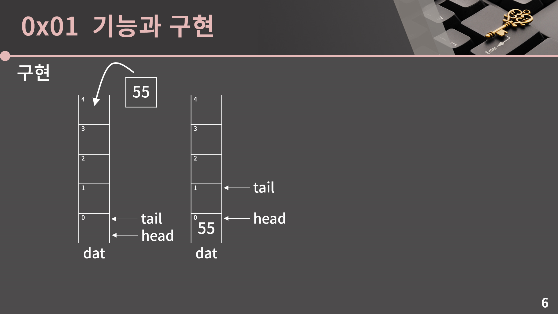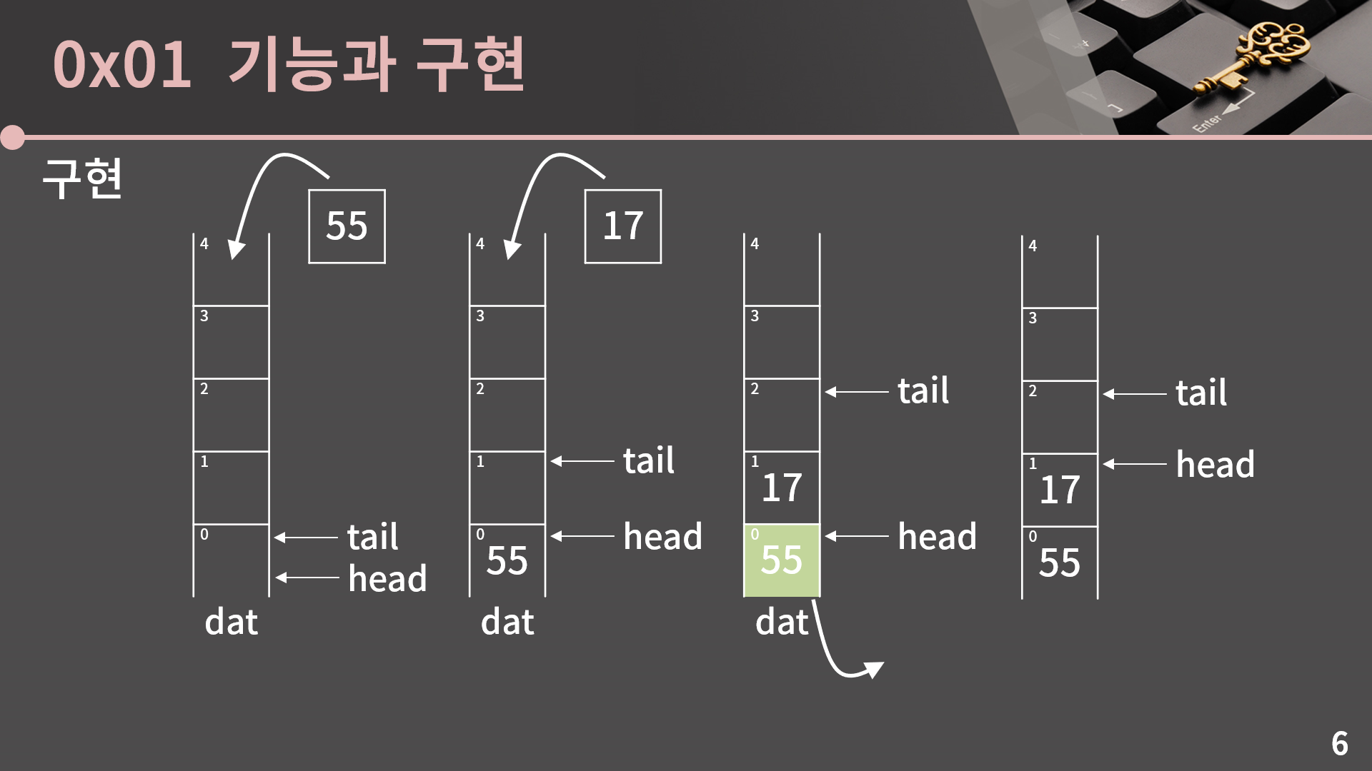 앞의 과정을 보면 push를 할 땐 tail이 증가하고, pop을 할 땐 head가 증가합니다. 그렇기 때문에 dat 배열에서 큐의 원소들이 들어있는 장소는 점점 오른쪽으로 밀립니다.