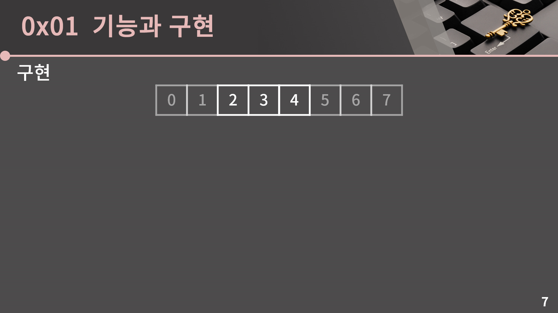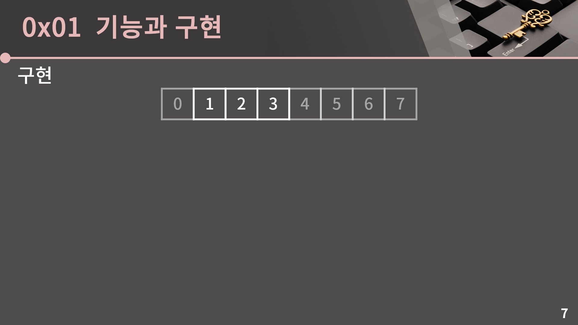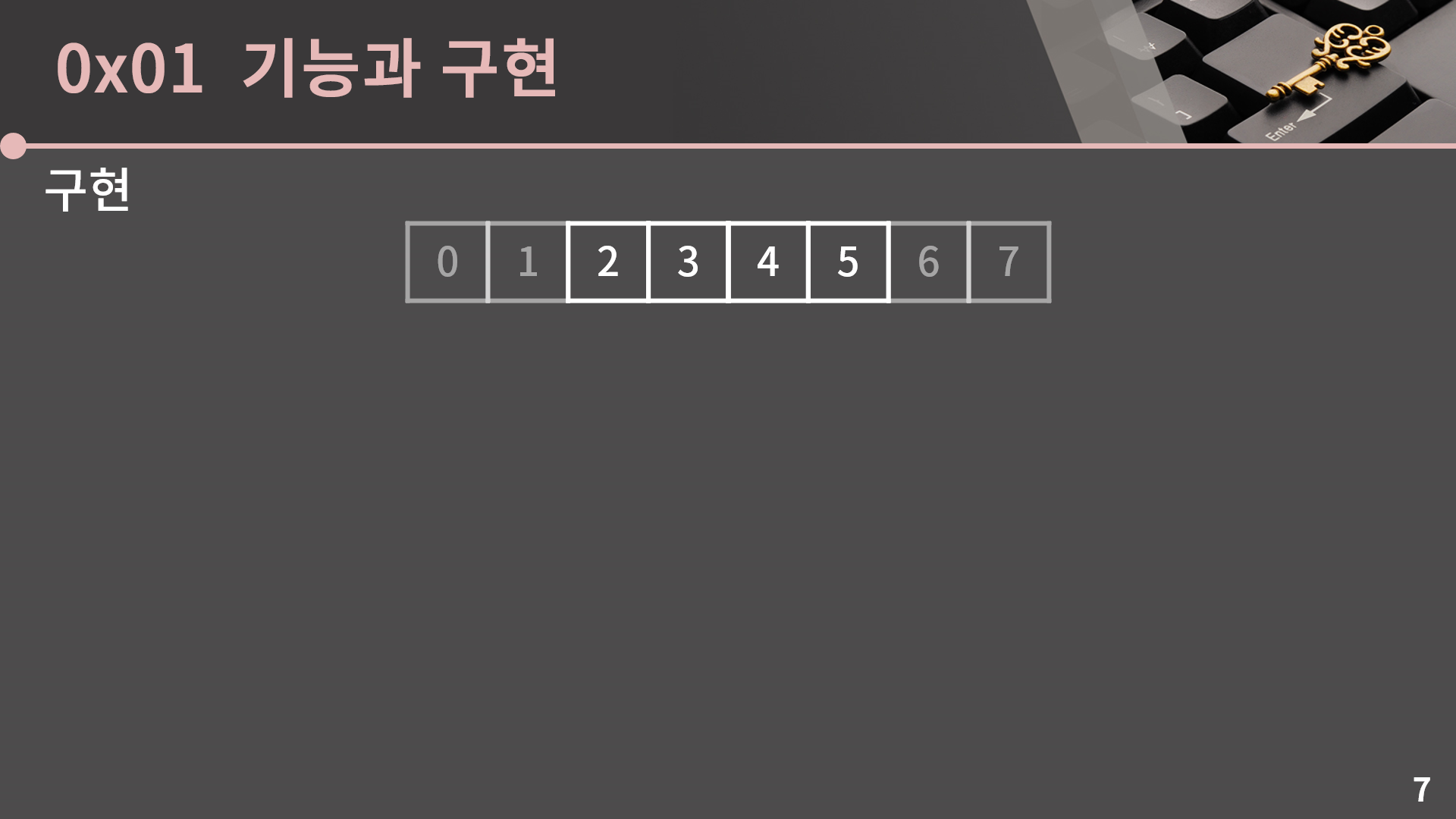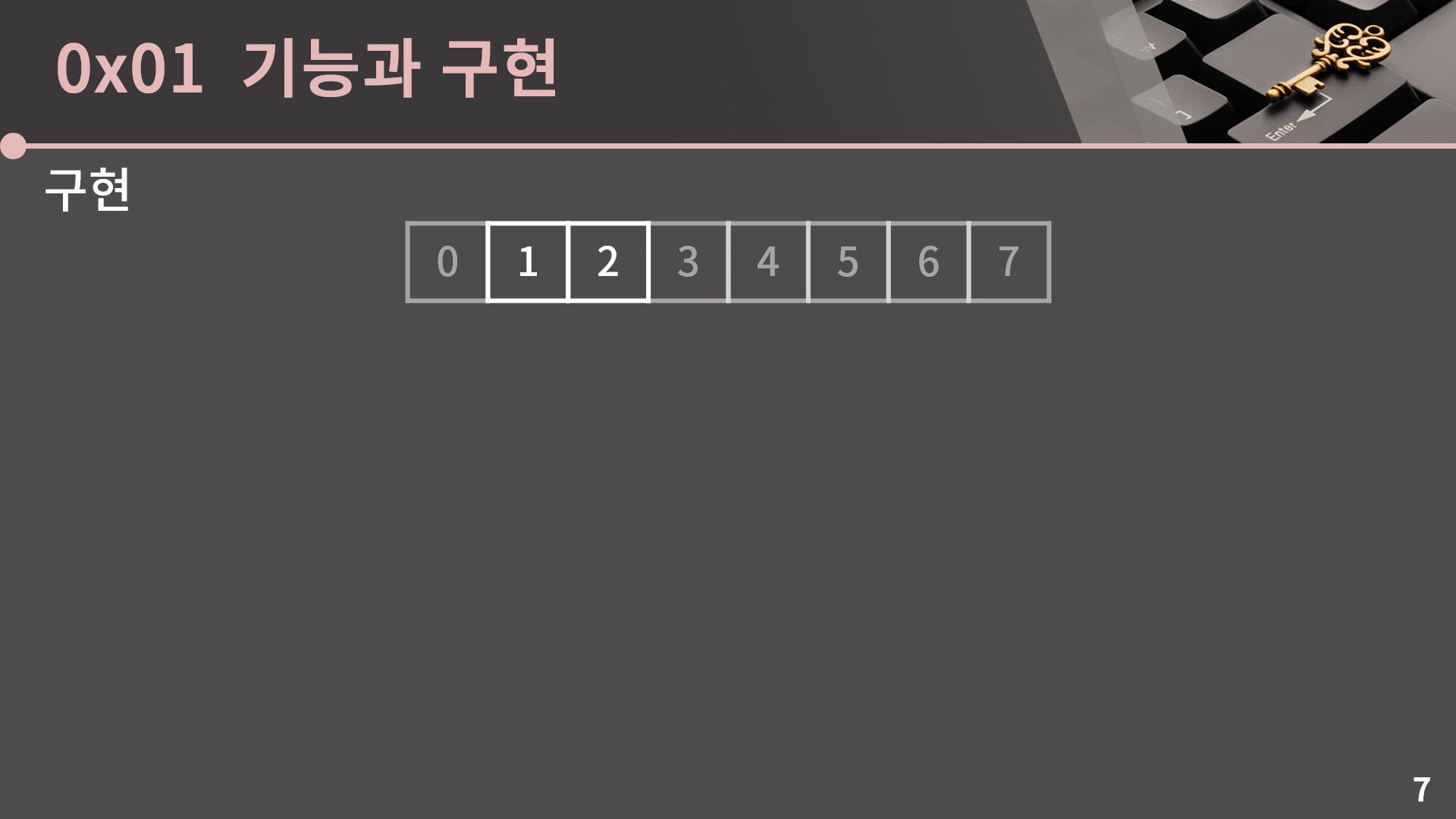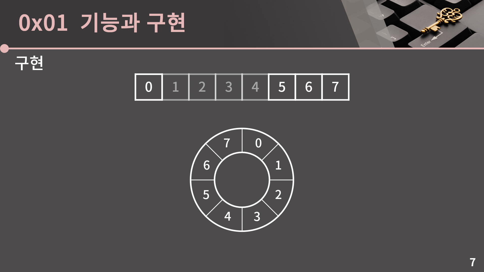 이와 같이 스택과는 다르게 큐는 배열로 구현하면 삭제가 발생할 때 마다 앞쪽에 쓸모없는 공간이 계속 생기게 됩니다. 이 문제를 해결하는 방법은 의외로 간단한데 큐의 원소가 들어갈 배열을 원형으로 만드는 것입니다. 관념적으로는 배열이 원형인거고, 실제 구현을 할 땐 head나 tail이 7인 상태에서 1이 더해질 때 0번지로 다시 오도록 만들면 됩니다.