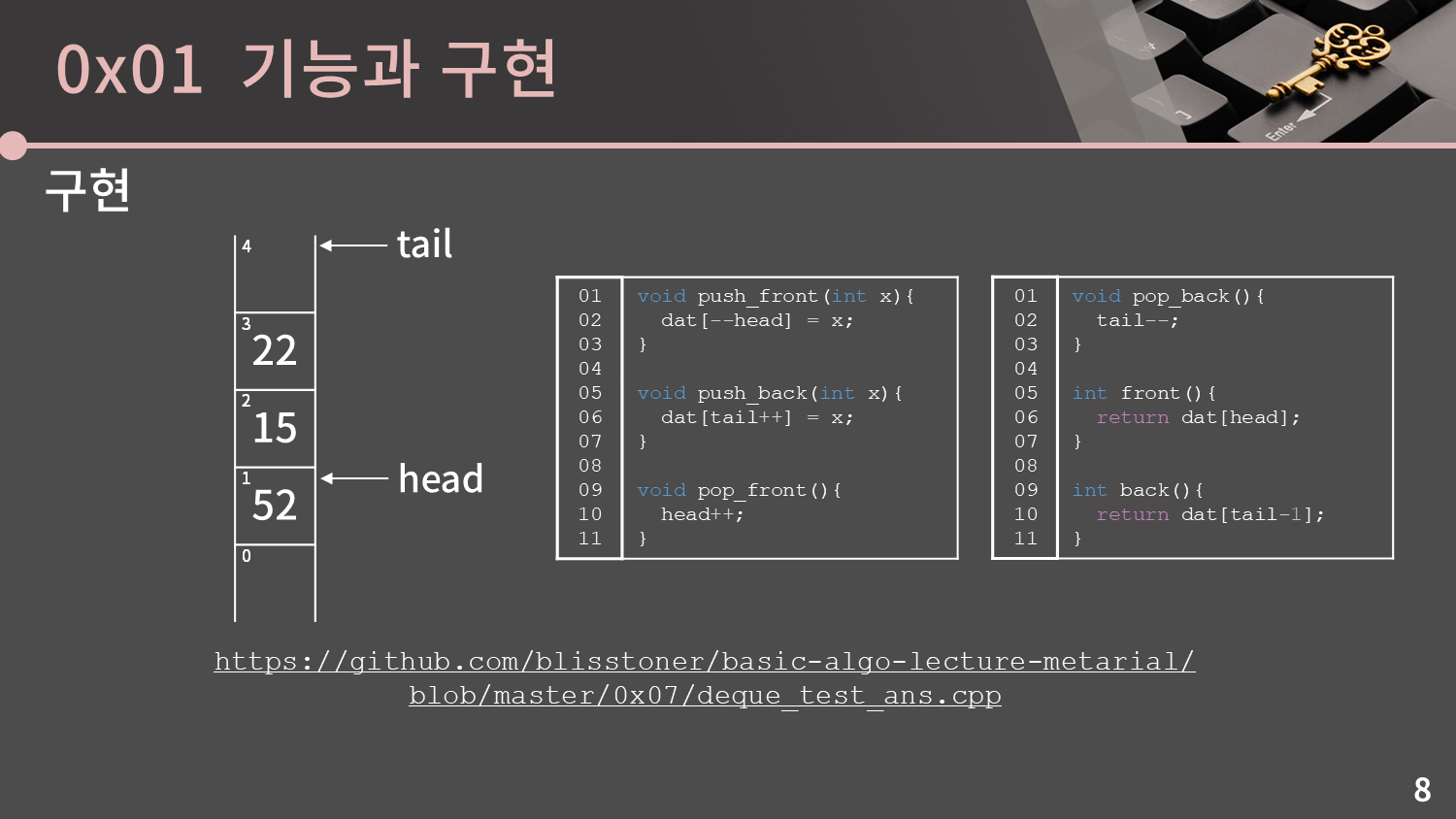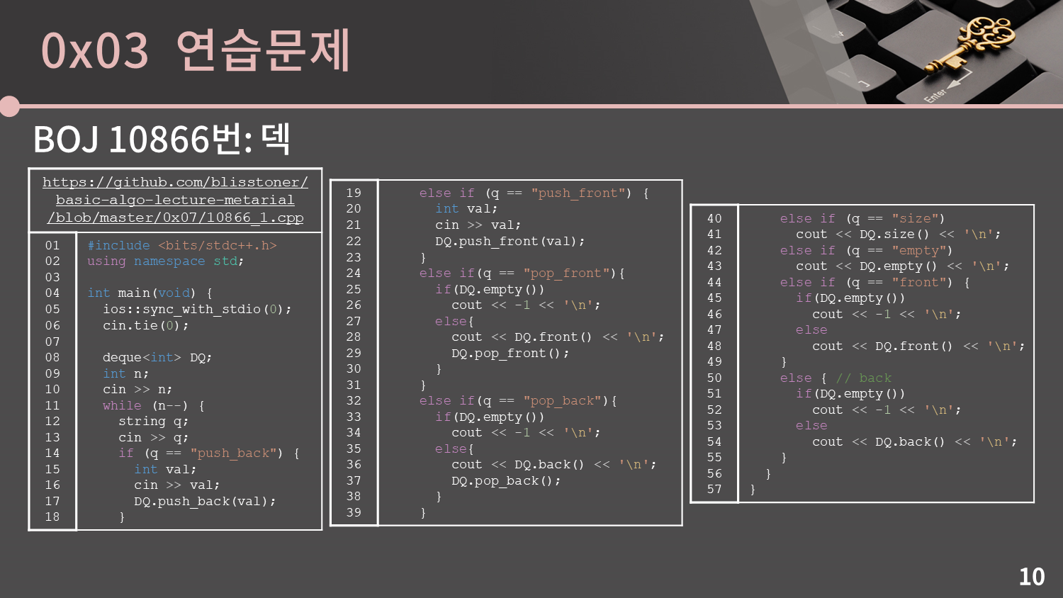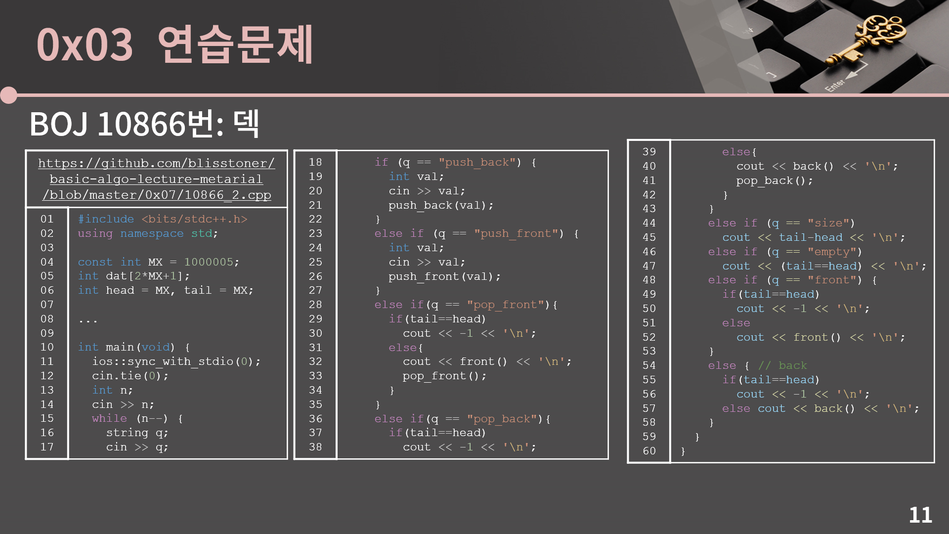 설령 앞의 스택과 큐 강의는 직접 구현을 하지 않고 그냥 슬라이드에 적힌 코드를 눈으로 본게 다라고 하더라도, 이번 덱만큼은 연습을 하는 차원에서 꼭 직접 짜봤으면 좋겠습니다. 스택과 큐를 구현했던 그 느낌을 가지고 배열의 어디에 값을 넣어야 하고 어떤걸 반환해줘야 하는지 잘 생각해보면 크게 어렵지는 않을 것입니다.(템플릿 링크)