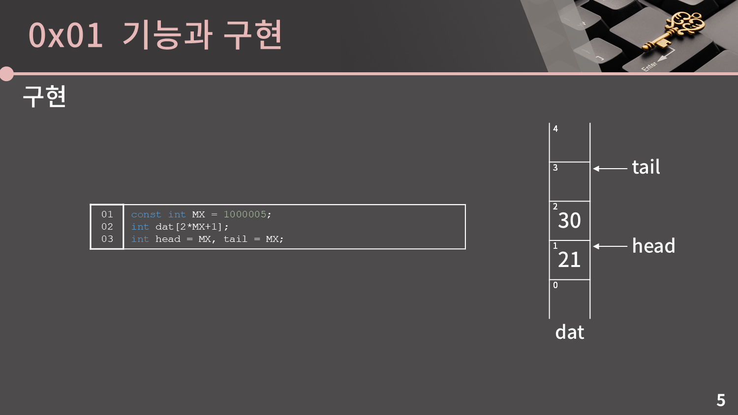 일단 필요한 변수는 큐랑 똑같이 원소를 담을 큰 배열 한 개와 앞쪽, 뒤쪽을 가리킬 변수 두 개입니다. 이 때 head와 tail을 두는 방식도 큐와 똑같습니다. head는 가장 앞에 있는 원소의 인덱스이고 tail을 가장 뒤에 있는 원소의 인덱스 + 1입니다. 그리고 head와 tail의 초기값이 0이 아니라 MX인데 이 부분을 좀 짚고 넘어가겠습니다.