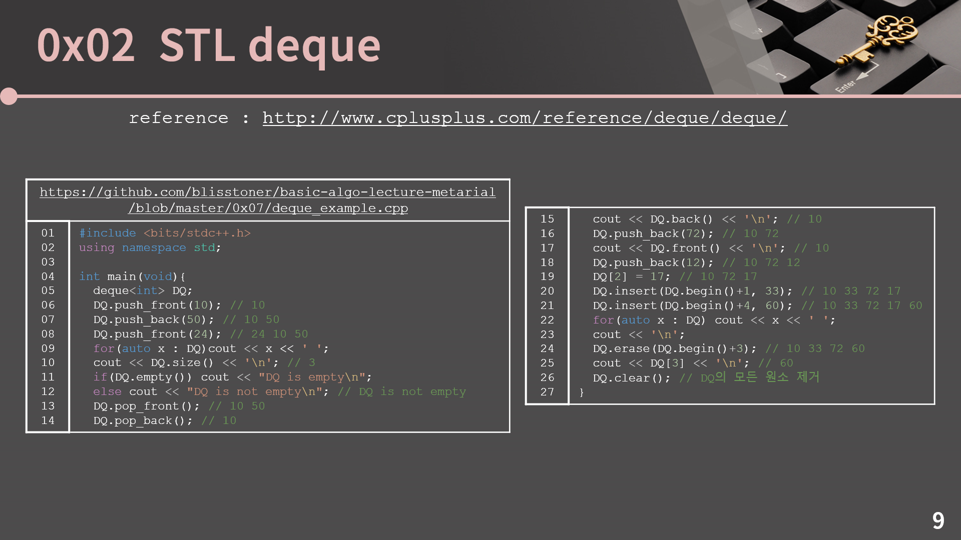 다만 어떤 것 하나만 알고 가시면 되냐면, 앞쪽과 뒷쪽에서의 추가와 제거가 모두 필요하면 당연히 STL deque을 사용하는게 효율적이지만 굳이 앞쪽에서의 추가와 제거가 필요하지 않고 배열과 같은 느낌으로 쓰고싶을 땐 STL deque말고 STL vector를 쓰면 됩니다. 참고로 deque 레퍼런스 문서에도 4번째 문단에 "Both vectors and deques provide a very similar interface" 어쩌구저쩌구 하면서 관련 얘기가 나와있어서 한 번 읽어보시는 것도 좋습니다.(레퍼런스 링크, 예제 링크)