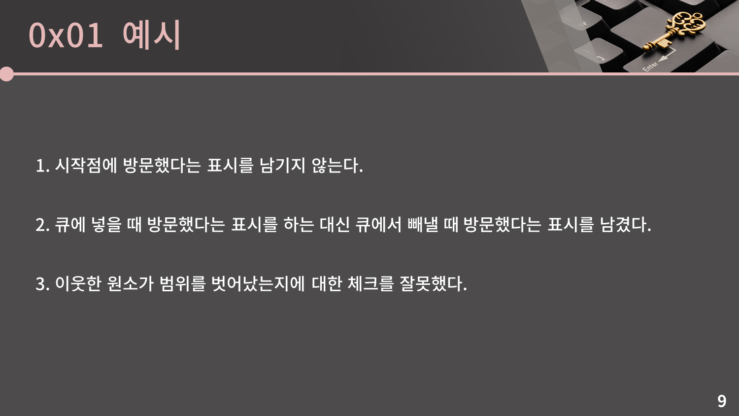 두 번째는 큐에 넣을 때 해당 칸에 방문했다는 표시를 남기지 않고 큐에서 빼낼 때 남기는 경우인데, 이렇게 되면 같은 칸이 큐에 여러 번 들어가게 되어서 시간 초과나 메모리 초과가 발생할 수 있습니다. 특히 이건 보통 예제로 주는 작은 케이스에서는 잘 돌아가다가 실제 제출을 했을 때 터지는 경우가 많기 때문에 주의해야 합니다.
