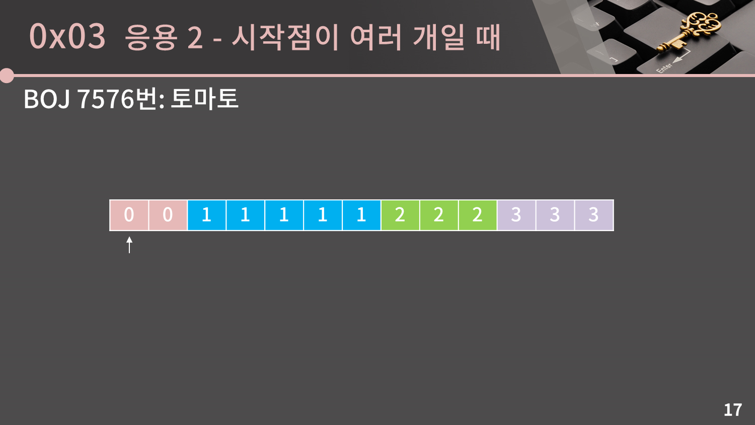 지금까지의 상황을 다시 정리해보면 우리는 지금 시작점이 여러 개인 BFS를 돌 수 있어야합니다. 그리고 해결법은 의외로 간단한데, 그냥 모든 시작점을 큐에 넣고 앞에서 한 것과 똑같이 BFS를 돌면 끝입니다. 지금 슬라이드에서의 그림을 보면 파란색은 익지 않은 토마토, 초록색은 익은 토마토, 빨간색은 빈 칸을 의미합니다. 현재 익은 토마토가 2개가 있는데, 그 2개를 큐에 넣어두고 BFS를 돌리면 이렇게 자연스럽게 거리가 잘 구해지게 됩니다.