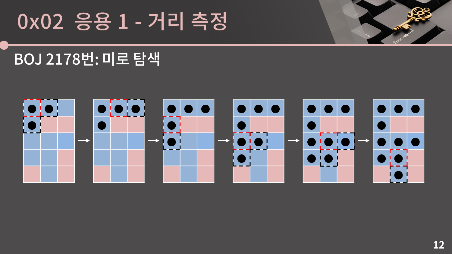 제일 첫 번째는 빨간색 칸에서 거리가 0인데 검정색 칸에서 거리가 1이고, 마지막껀 빨간색 칸에서 거리가 4인데 검정색 칸에서는 거리가 5입니다. 이 성질을 활용하면 우리는 단순히 상하좌우로 연결된 칸들을 방문하는 것에서 끝나는 것이 아니라, 시작점과의 거리를 전부 계산할 수 있습니다.
