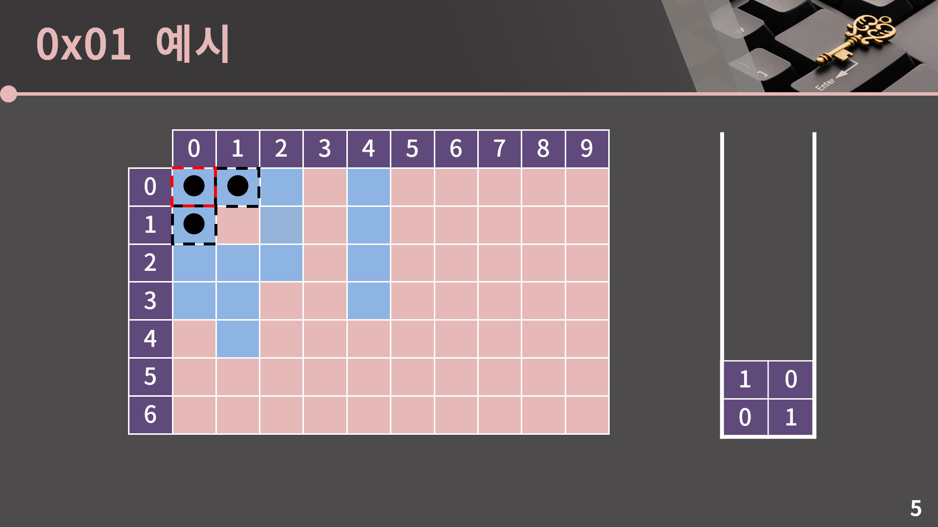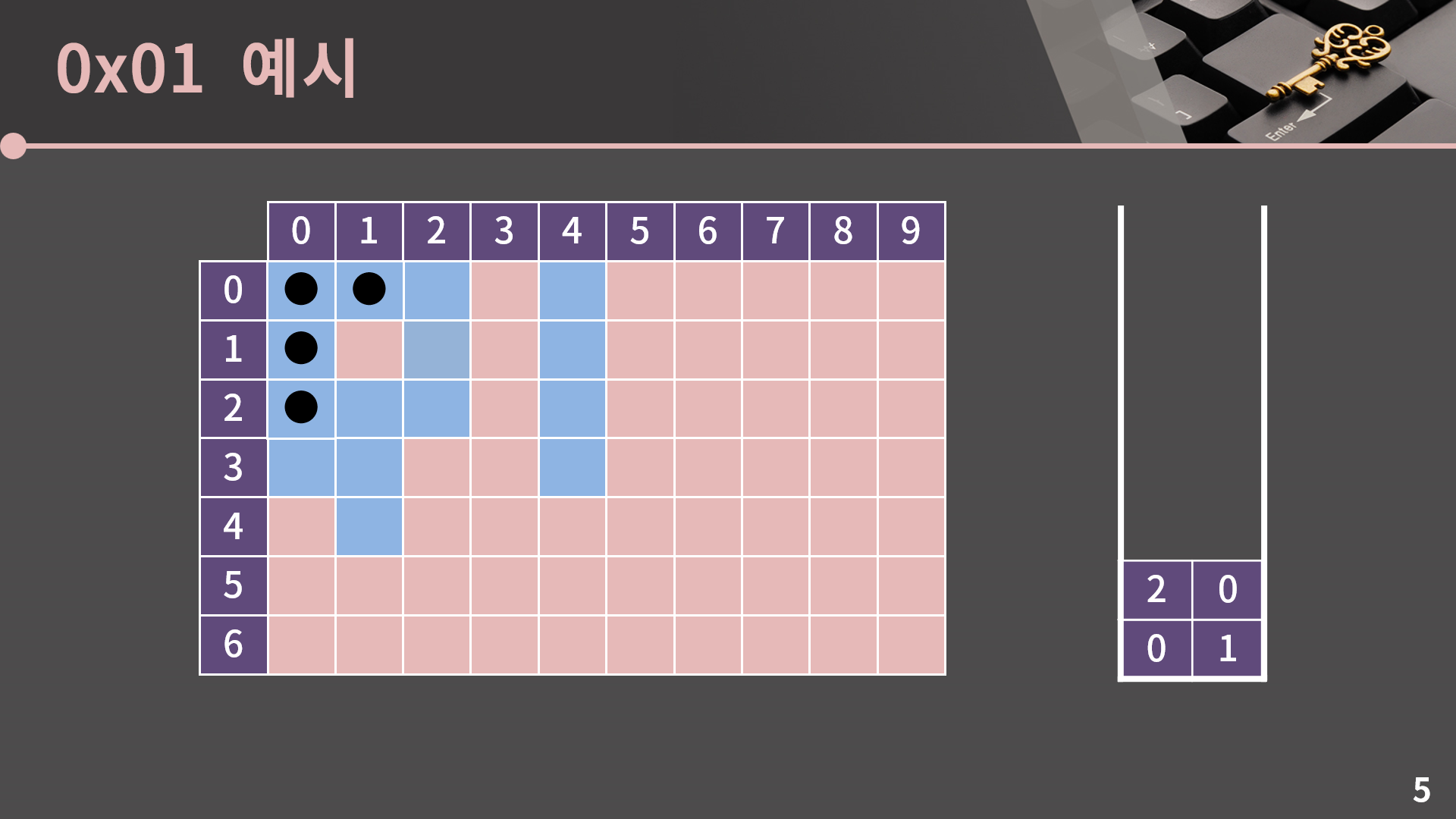 보면 (0, 1)과 (1, 0)이 모두 파란 칸이면서 아직 방문하지 않은 칸이니 방문했다는 표시를 남기고 스택에 넣습니다.
