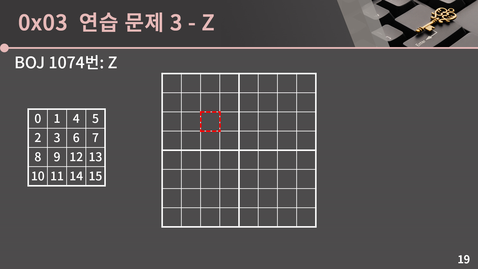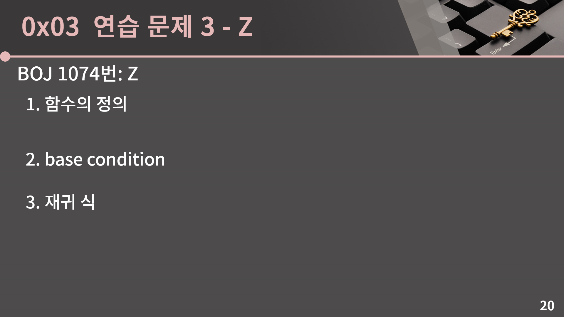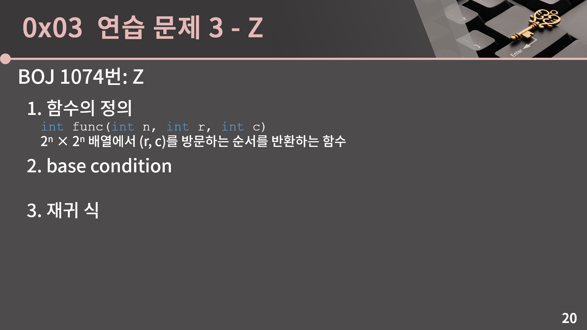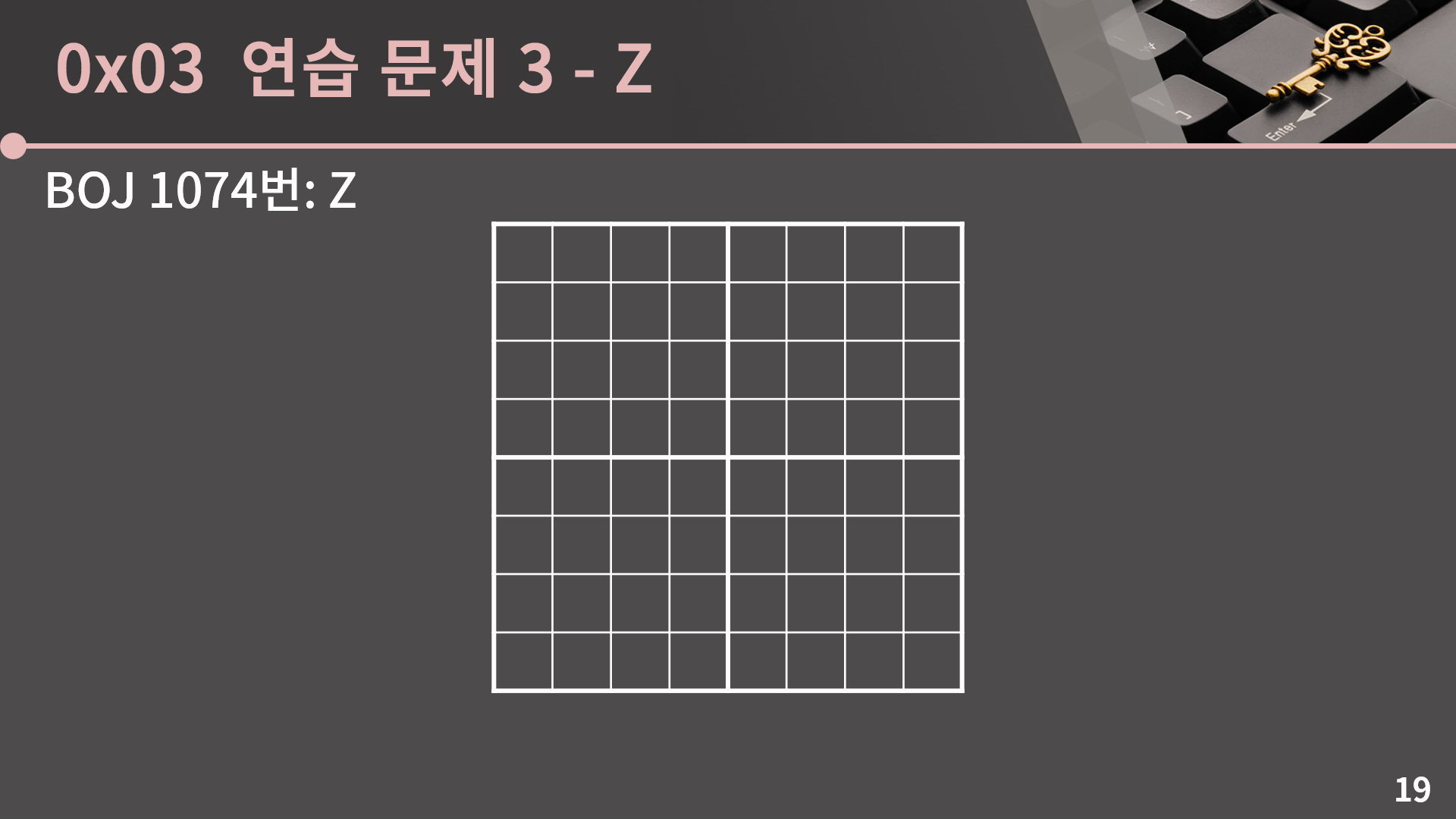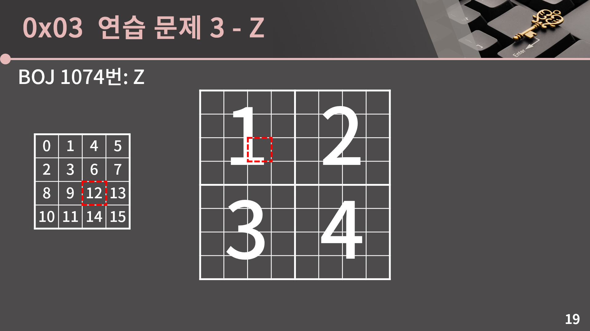 하노이 탑을 끝내고 뭔가 아리송하지만 그래도 재귀가 조금이나마 친숙해졌다고 생각이 드는지 모르겠습니다. 그런데 아마 BOJ 1074번: Z를 보고 오시면 다시 재귀가 정 떨어질겁니다. 문제를 보면 진짜 좀 어쩌라는건가 싶죠? 고통스럽겠지만 내 안의 잠재력을 믿고 생각해보는 시간을 한 5분 정도만 가져보겠습니다. 잠깐 멈춰놓고 재귀적인 관점에서 생각을 한 번 해봅시다.