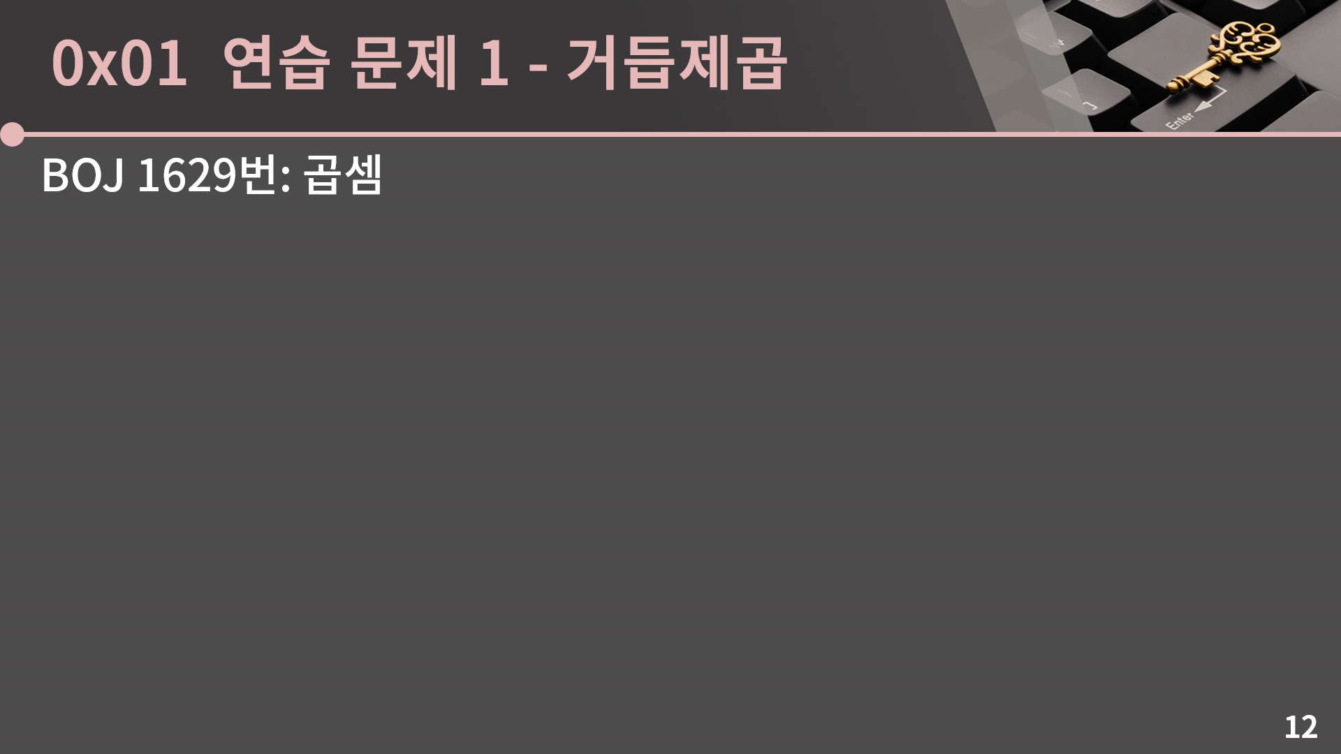 이 함수의 시간복잡도는 b가 계속 절반씩 깎이기 때문에 O(log b)입니다. 그래서 문제의 시간 제한을 아주 넉넉하게 지킬 수 있습니다. 만약 직접 짜서 냈는데 틀렸거나 시간 초과가 발생했다면 int overflow가 발생했거나, POW 함수 내에서 POW 함수를 1번 부르는게 아니라 2번 불러서 시간복잡도가 O(log b)가 아닌 O(b)가 됐거나, base condition을 빼먹었거나 하는 이유 등을 짐작해볼 수 있습니다.
