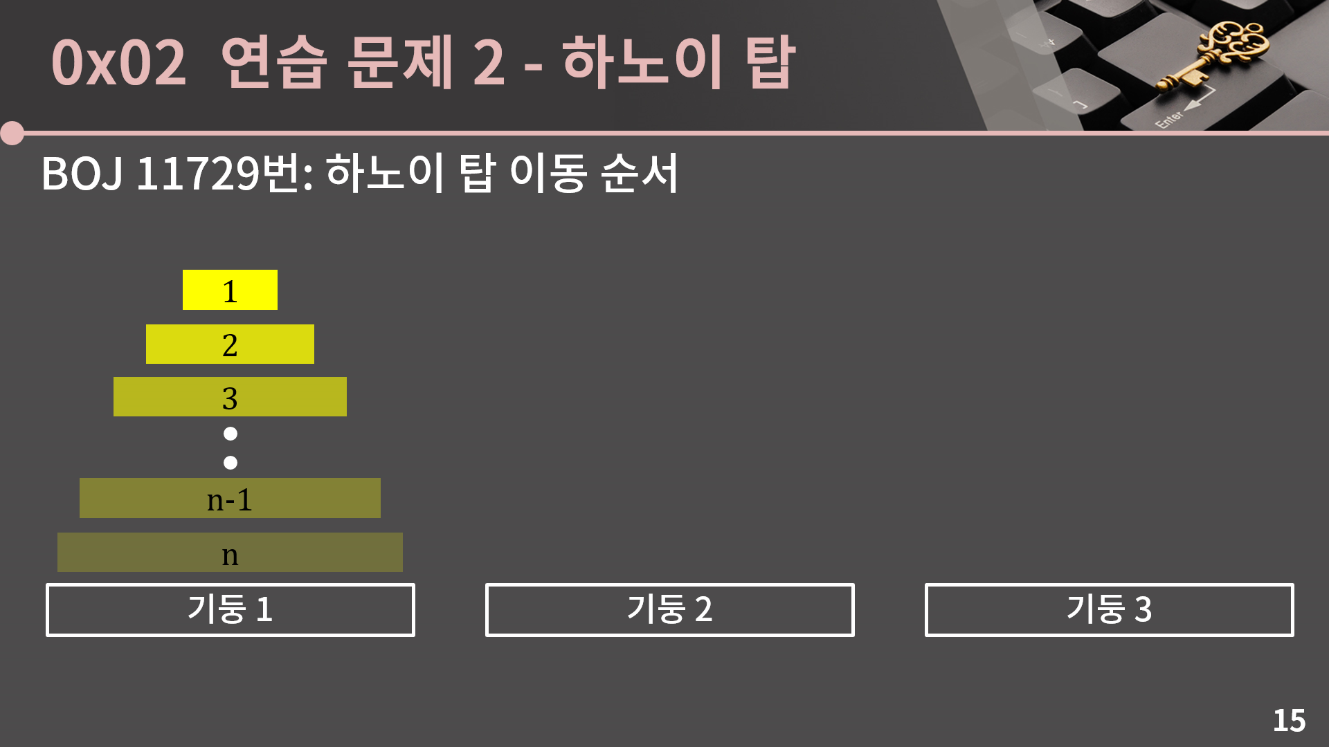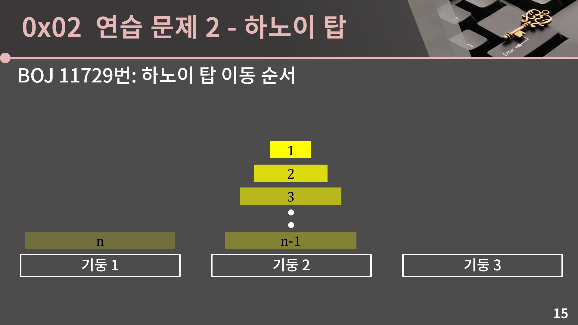 이 다음에는 무엇을 해야할지 알겠죠? n-1개의 원판을 기둥 2에서 기둥 3으로 옮기면 됩니다.