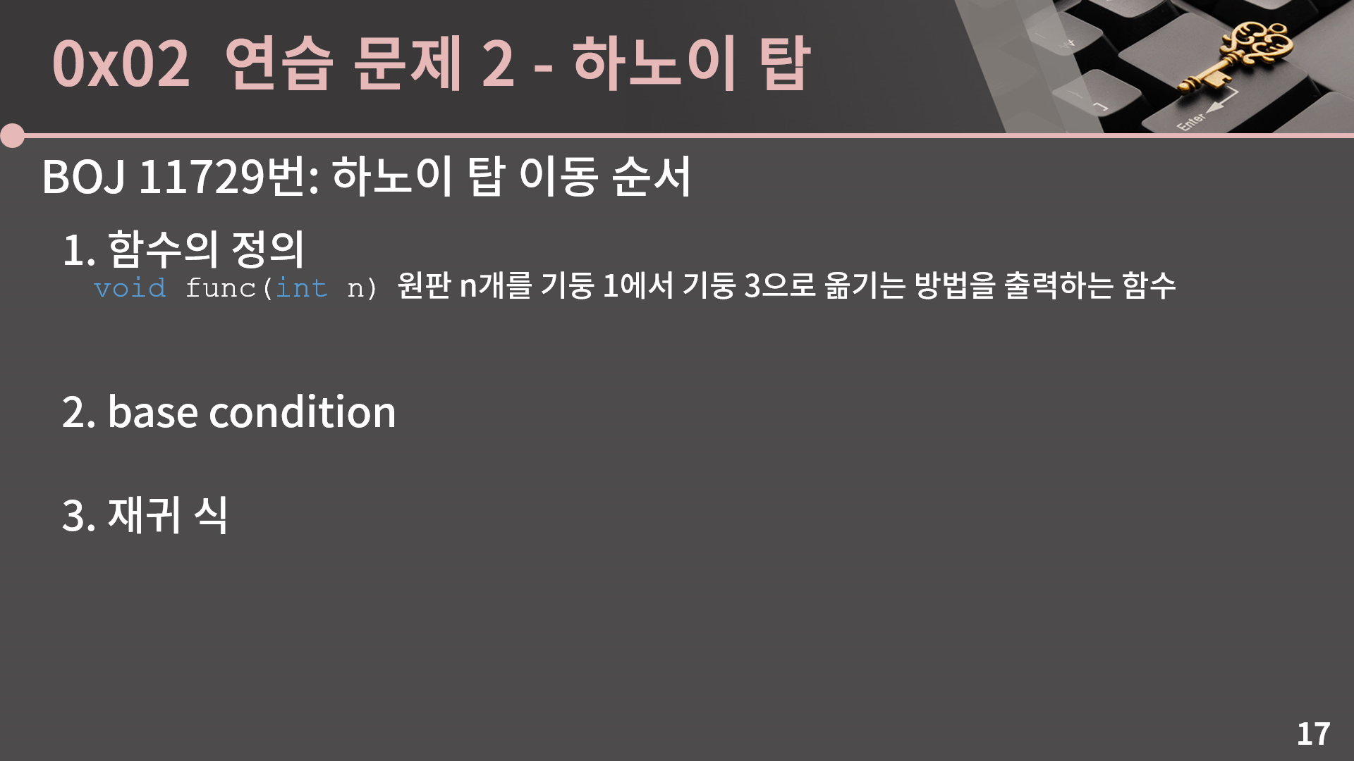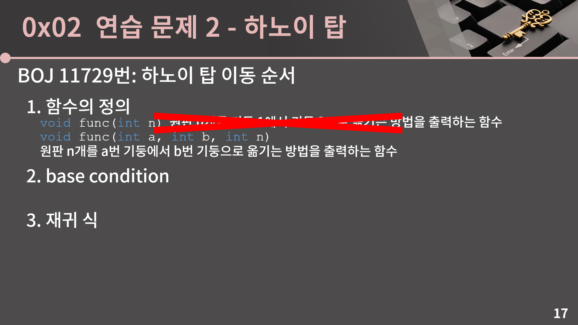 일단 먼저 함수를 정의해야 합니다. 함수를 정의한다는건 함수가 어떤 역할을 수행하는지, 어떤 인자를 받는지를 정하는 것입니다. 일단 딱 쉽게 생각할 수 있는 형태는 이런 형태입니다. func 함수를 이렇게 정의했는데 재귀가 늘 그렇듯 우리는 func(n) 내에서 func(n-1)을 불러야 하는데 이 재귀 식이 상상이 가나요? 아쉽지만 지금 func 함수에는 큰 결함이 있는데 func(n), 즉 원판 n개를 기둥 1에서 기둥 3으로 옮기려면 원판 n-1개를 기둥 1에서 기둥 3으로 옮기는게 아니라 기둥 2로 옮겨야 합니다. 그러면 func(n-1)을 활용할 수가 없습니다. 그래서 지금 이 함수는 이 문제를 풀기에 적절하지 않습니다.
