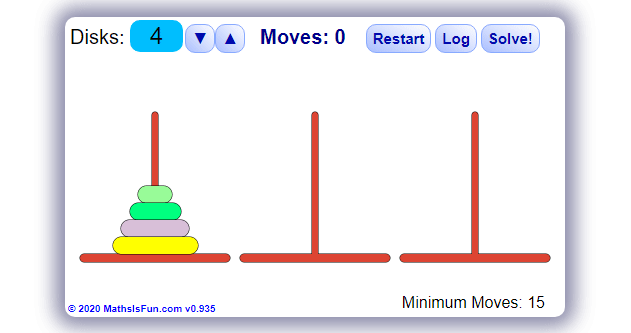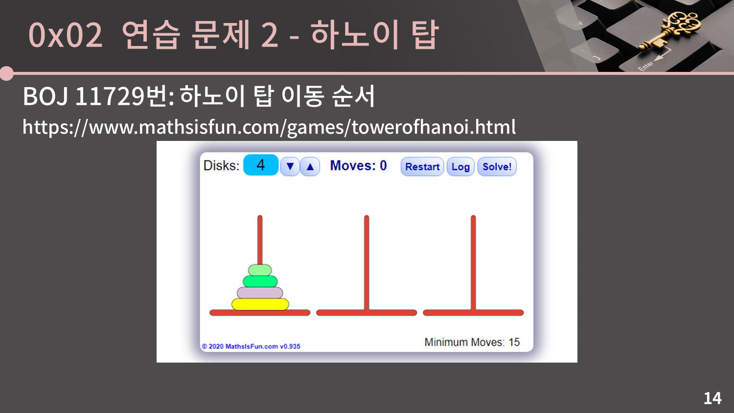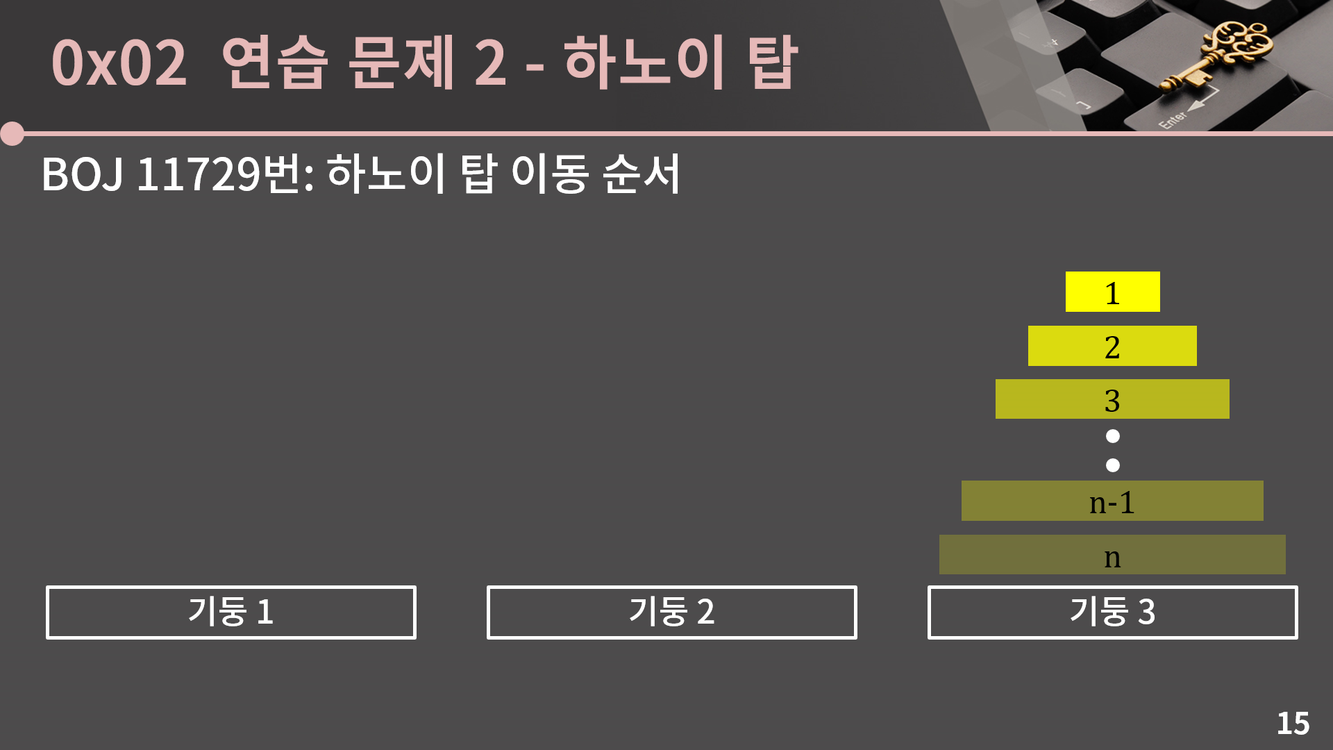 아무튼 하노이 탑을 처음 들어보거나 규칙이 좀 가물가물하면 일단 온라인으로 해볼 수 있는 링크에 들어가서 하노이 탑을 한 번 해보고 오시면 좋을 것 같습니다. 원판이 3, 4, 5개일 때를 다 깨보는 것을 추천드립니다. 꼭 다 깨고 오셔야 다음 진행이 수월할 것입니다.