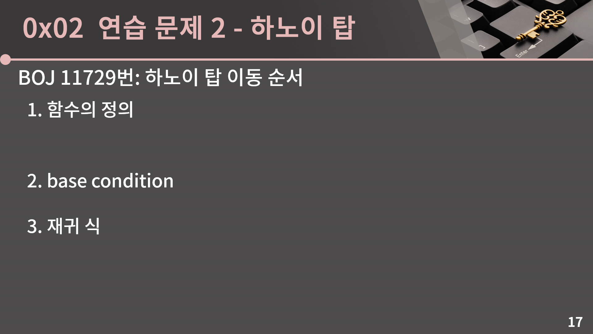 먼저 재귀에서는 함수를 명확하게 정의해야 합니다. 정의라는건 함수의 인자로 어떤 것을 받을지, 그리고 어디까지 계산한 후 자기 자신에게 넘겨줄지를 의미합니다. 예시 문제를 풀어볼 때 함수의 형태를 잡는 부분을 계속 강조할 것입니다.