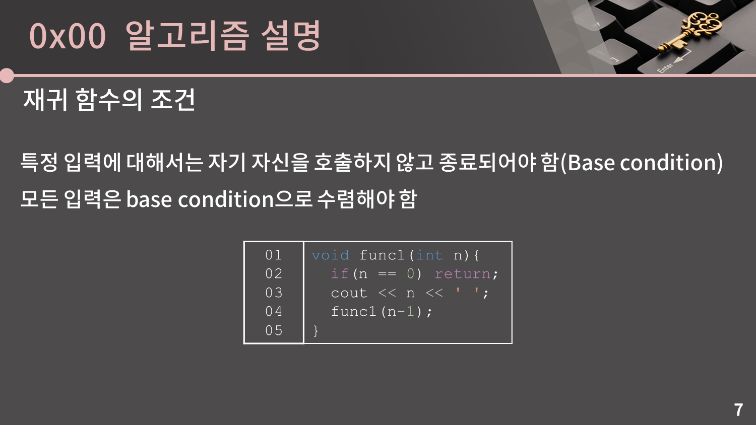 앞의 예시를 통해서 귀납적인 방식으로 생각하는 것에 익숙해지길 바라며 설명을 마저 이어가겠습니다. 올바른 재귀 함수는 반드시 특정 입력에 대해서는 자기 자신을 호출하지 않고 종료되어야 합니다. 이러한 입력을 base condition 내지는 base case라고 합니다.