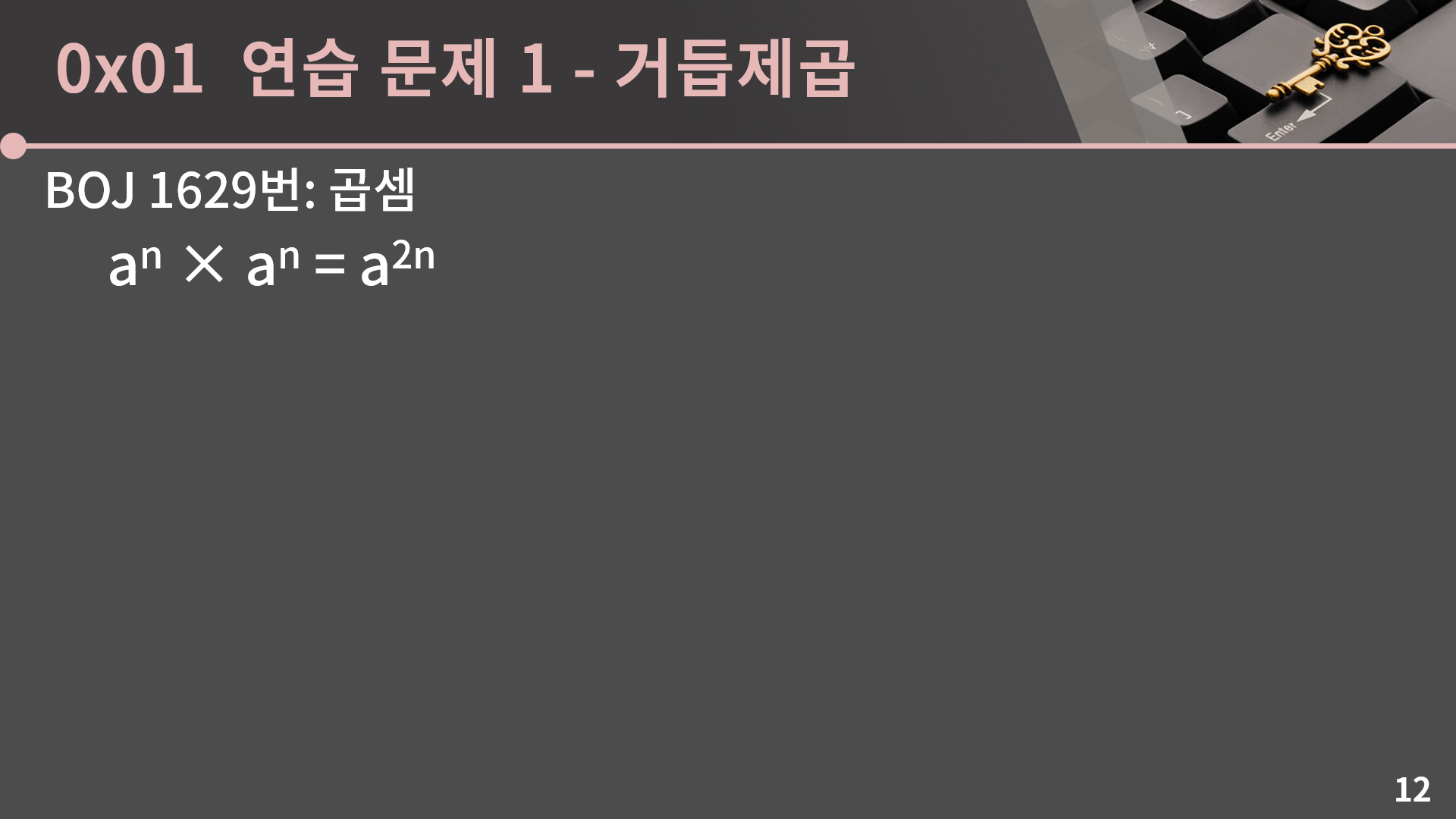 1258 과 12116 의 관계에서 보듯 k승을 계산했으면 2k승을 계산할 수 있다는건 이해가 갈거고, 2k승을 계산하고 a를 한 번만 곱해주면 2k+1승이 구해지니 2k승과 2k+1승 모두 k승을 계산했으면 O(1)에 계산할 수 있습니다. 이 두 문장이 참이기 때문에 우리는 a의 임의의 지수승을 귀납적으로 계산할 수 있습니다.