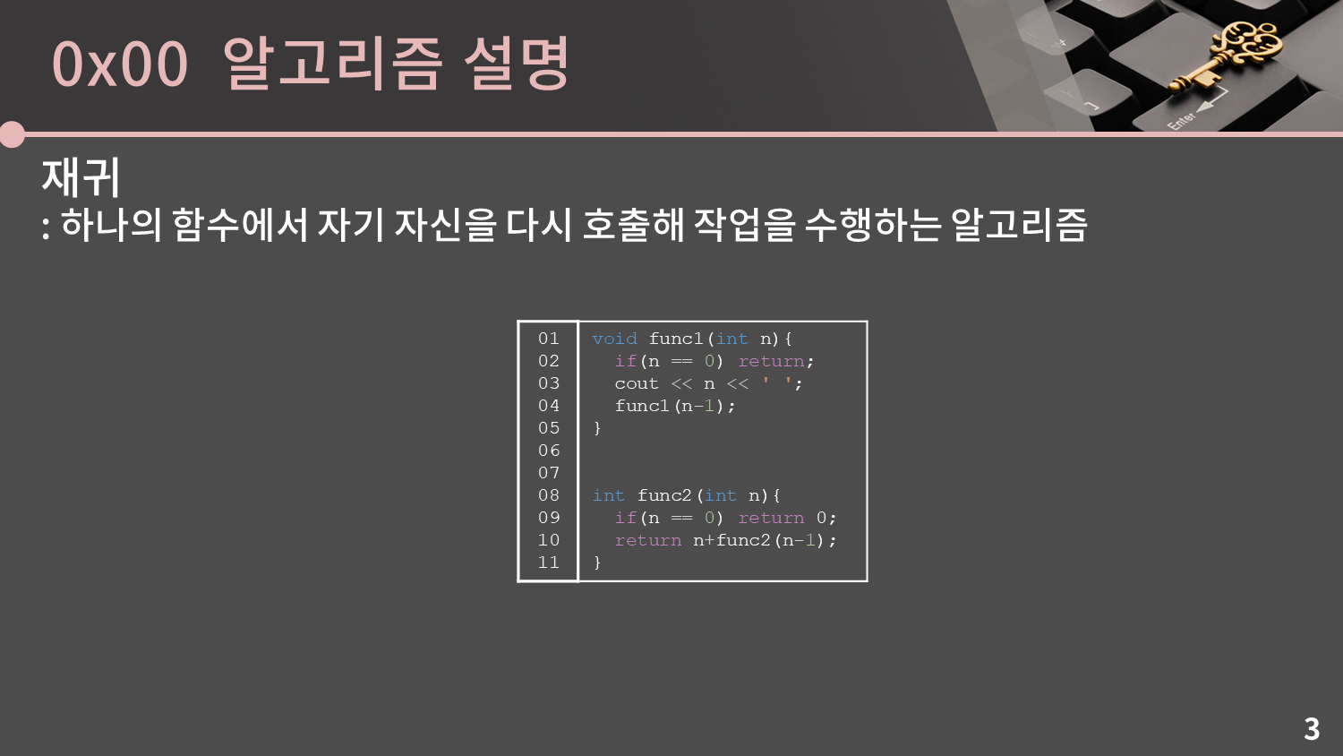 방금껀 드립이고 좀 그럴싸한 용어로 정의를 해보자면 재귀는 하나의 함수에서 자기 자신을 다시 호출해 작업을 수행하는 알고리즘입니다. 언어를 배울 때 보통 재귀를 다루니 재귀를 아예 처음 보는 분은 없을 것 같은데, 재귀로 N부터 1까지 출력하는 함수와 1부터 N까지의 합을 구하는 함수를 한 번 짜보는 시간을 가져보겠습니다.