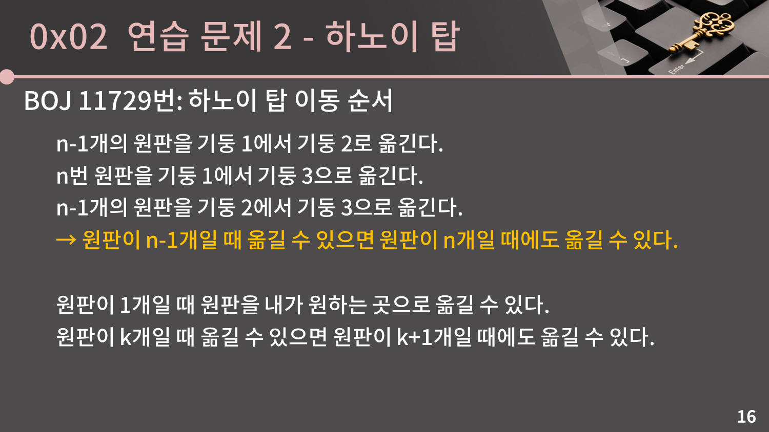이걸 알아냈다면 다 끝난건데 원판이 1개일 때에는 자명하게 옮길 수 있고 원판이 k개일 때 옮길 수 있으면 원판이 k+1개일 때에도 옮길 수 있다는걸 같이 봤으니 귀납적으로 이 문제를 풀 수 있음을 알게된 것입니다.