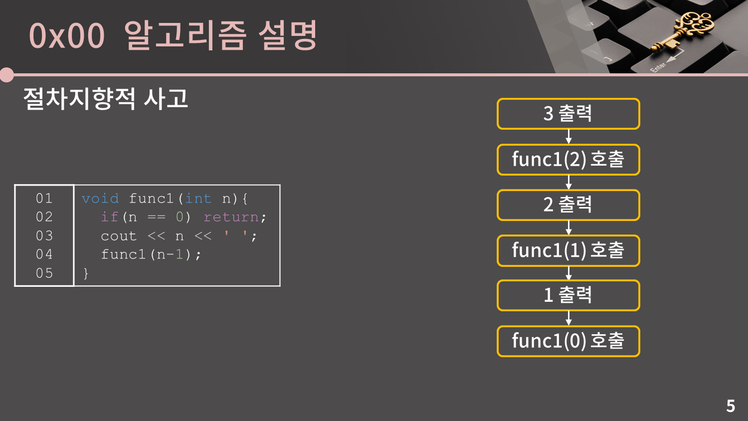 이 두 문장이 참이므로 귀납적으로 func1 함수가 n부터 1까지 차례로 출력하는 함수임을 알 수 있게 됩니다. 이제 귀납적으로 생각하는 것에 친숙해졌나요?