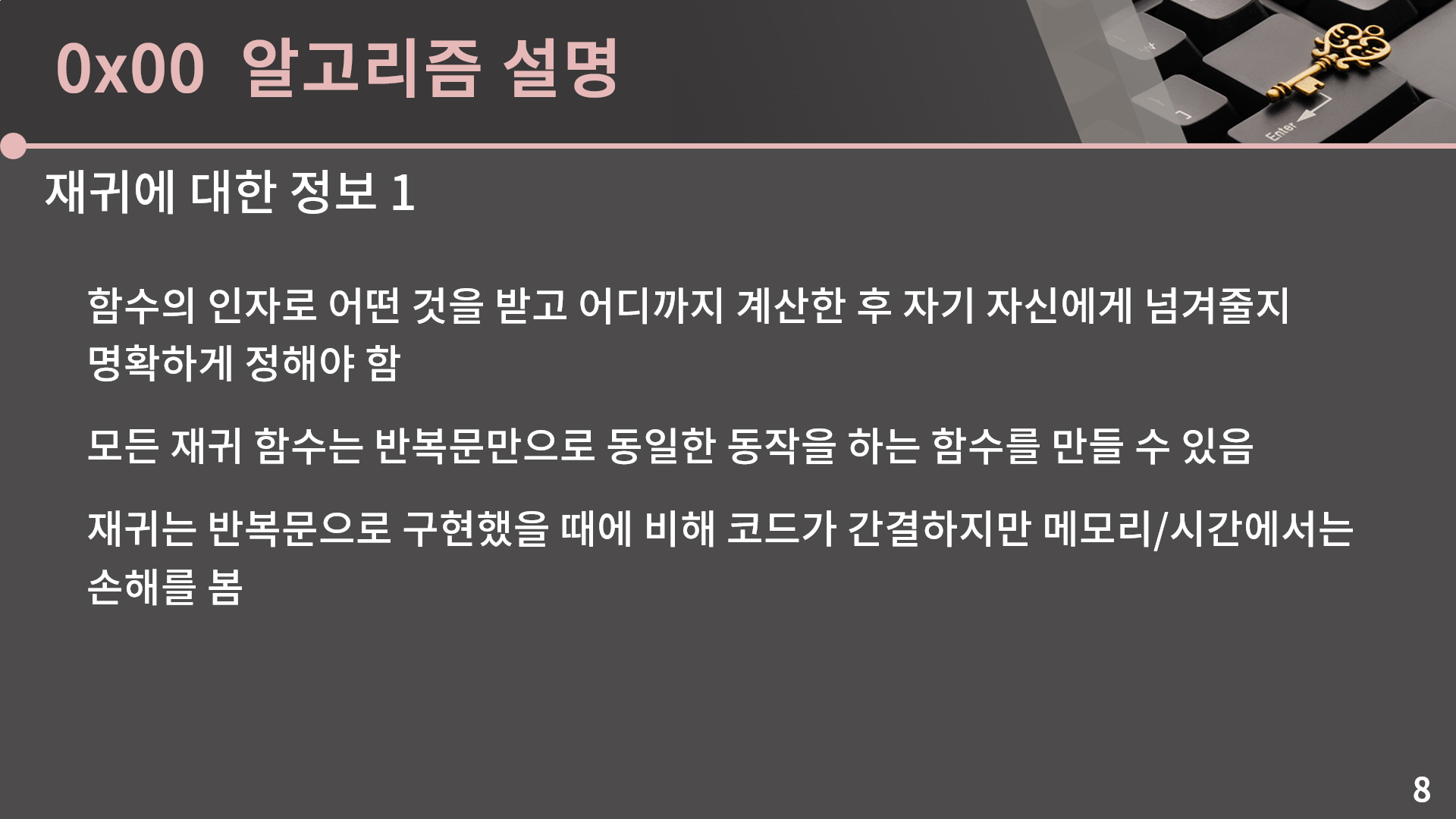 지금까지 같이 살펴본 내용을 바탕으로 재귀 함수를 만들 수 있겠나요? 다음 슬라이드에 바로 코드가 있으니까 꼭 먼저 시도해보고 넘어오시길 바랍니다.