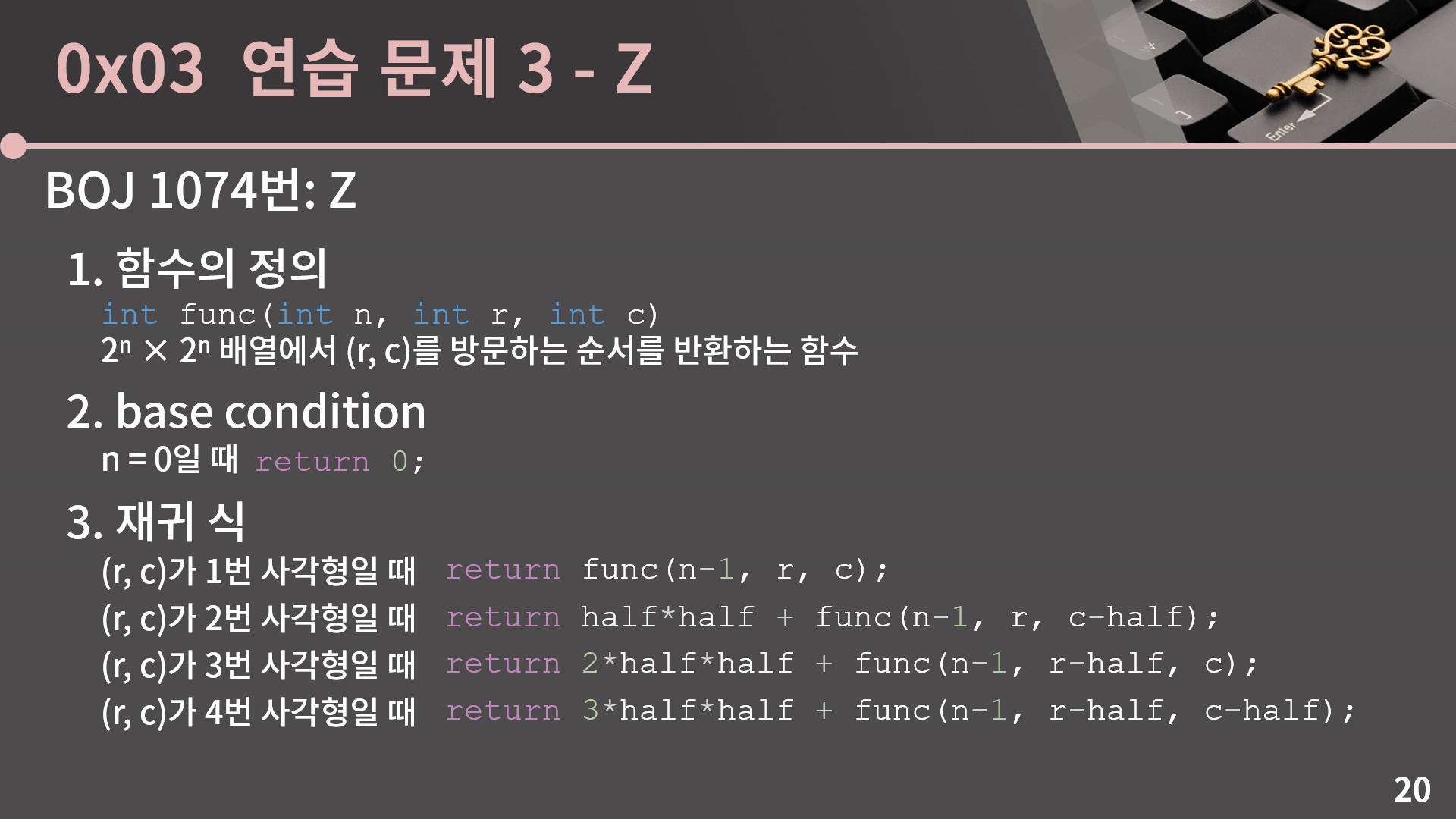각 상황에 따른 반환 값은 위와 같습니다. 여기서 half는 한 변 길이의 절반, 즉 2n-1입니다. 이제 이것들을 합쳐서 구현을 하면 끝입니다.