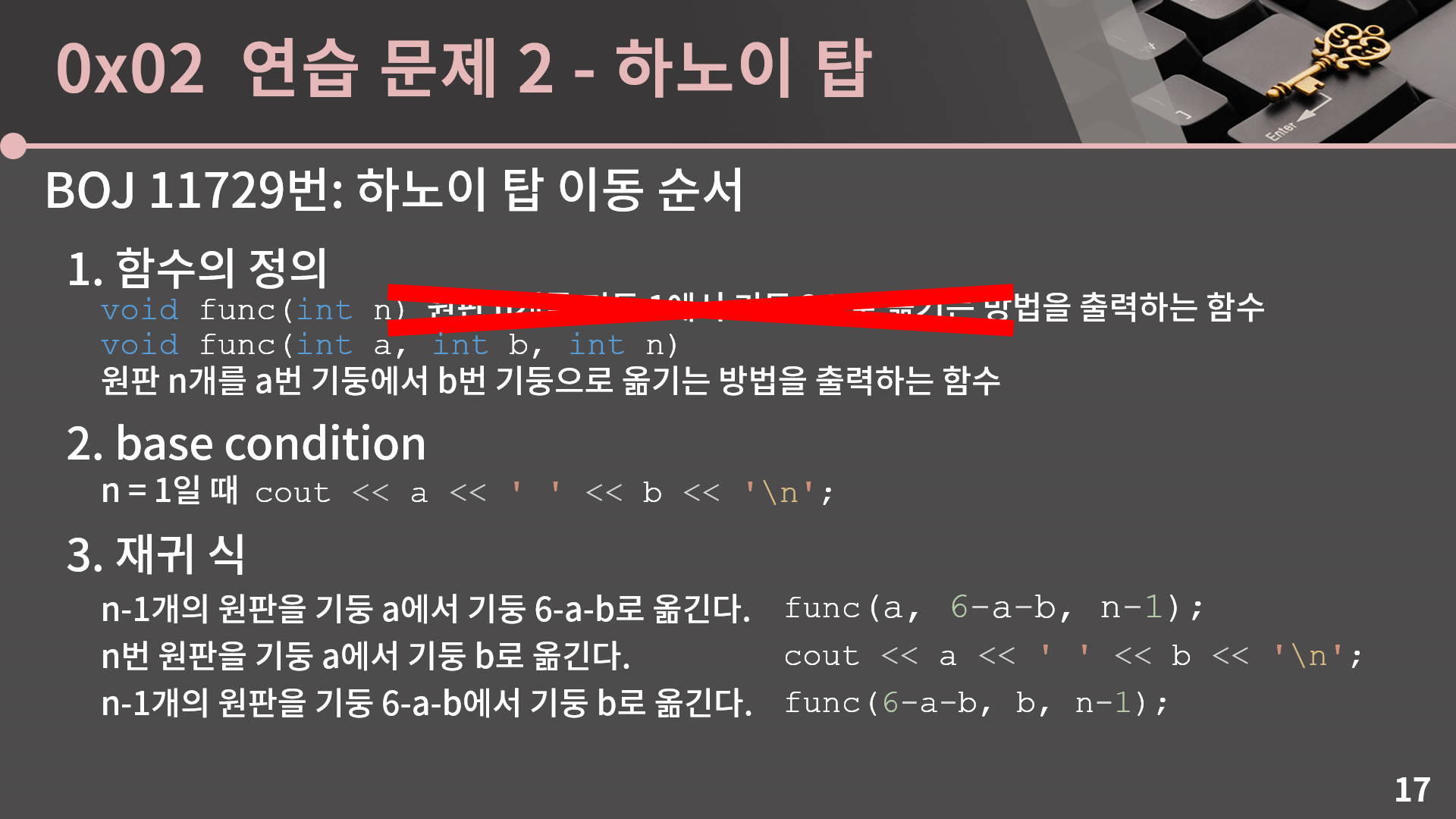 그럼 도대체 함수는 어떤 형태여야 하냐면, 시작 기둥과 도착 기둥도 인자로 받는 함수여야 합니다. 이렇게 인자 a와 b를 추가로 두면 해결이 가능하고 구체적인 식은 재귀 식에서 보겠습니다.