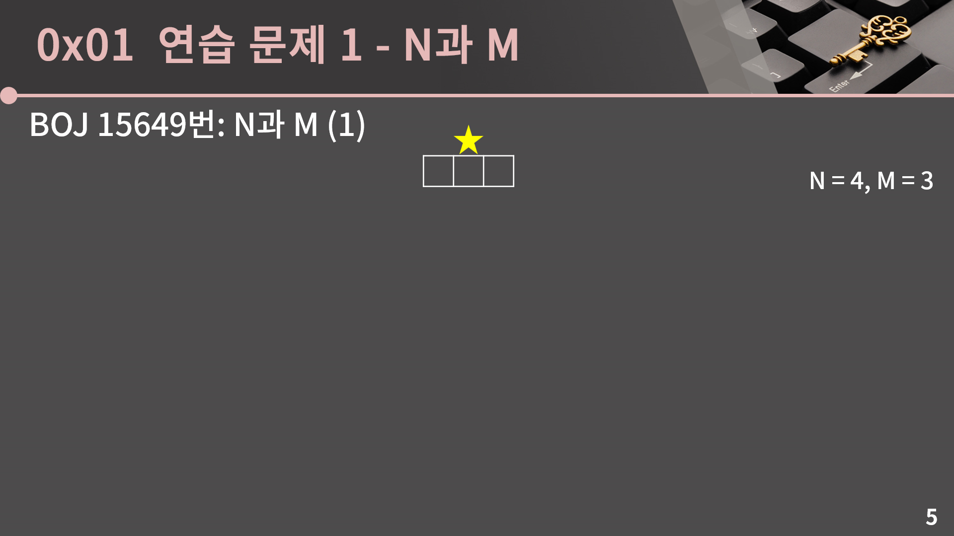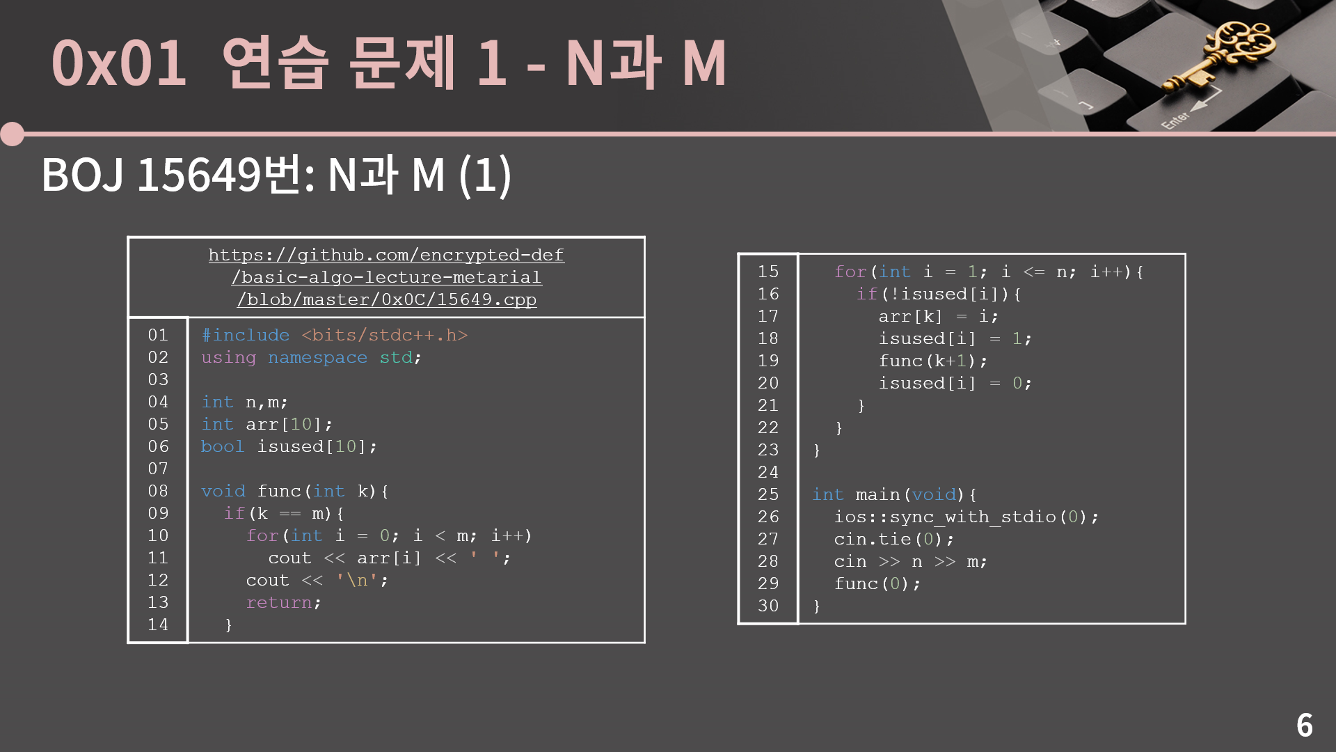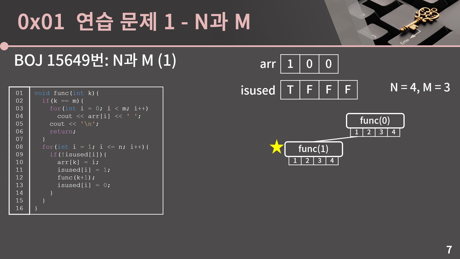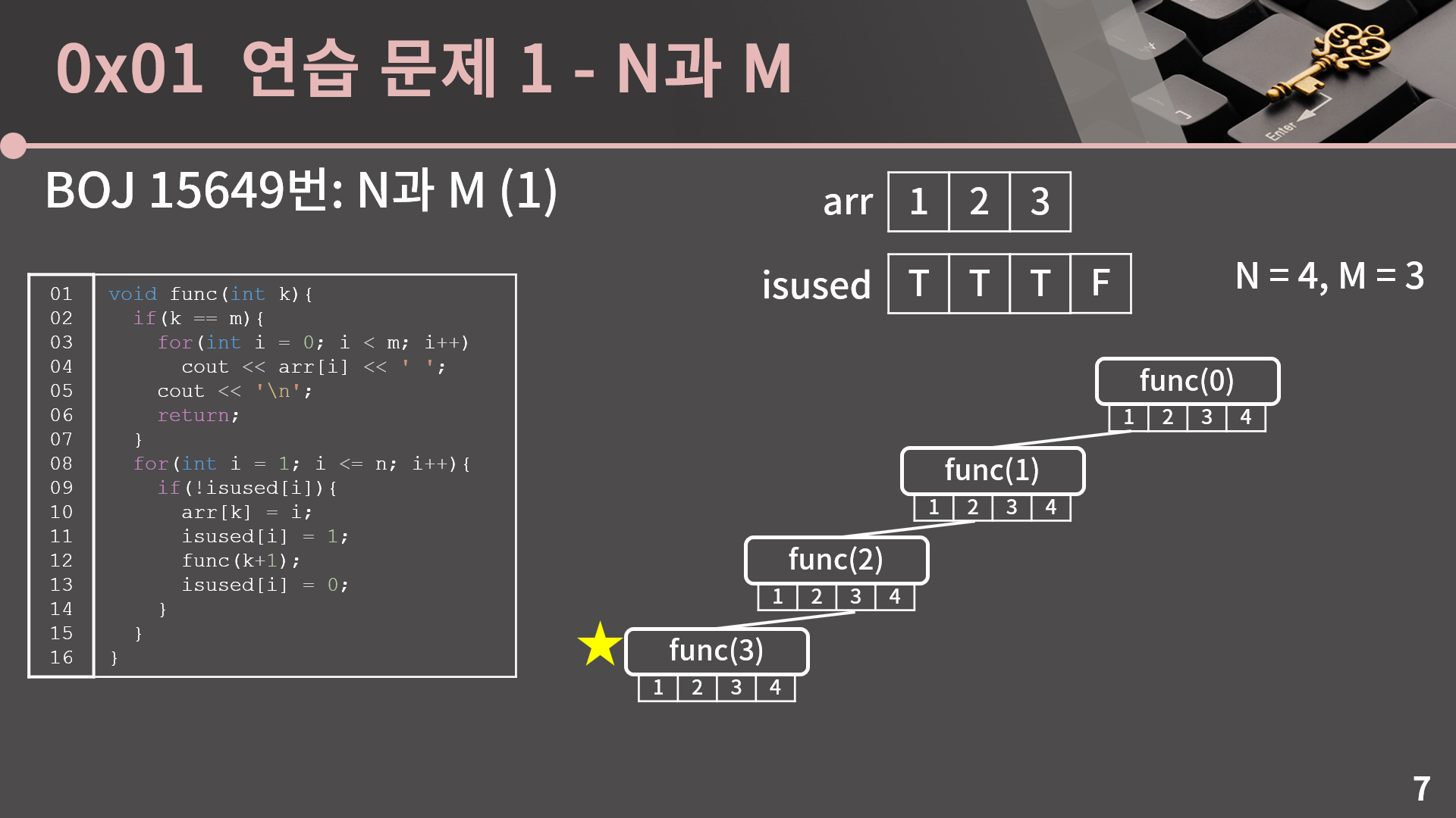 제 생각에 15 ~ 22번째 줄이 백트래킹의 핵심이면서 한편으로는 재귀에 어느 정도 익숙하다고 해도 정말 헷갈릴 파트입니다. 다음 슬라이드에서 n = 4, m = 3일 때를 예시로 들어 다시 설명을 드리긴 하겠지만 이해가 안간다면 함수의 중간 중간 arr, isused, k를 출력한다던가 하는 방식으로 동작 원리를 세밀하게 들여다보시고, 그래도 헷갈리는게 있다면 100% 이해하려고 하기 보다는 이 기본 틀을 바탕으로 n과 m 시리즈들을 풀어보면 자연스럽게 체화될 수도 있습니다.