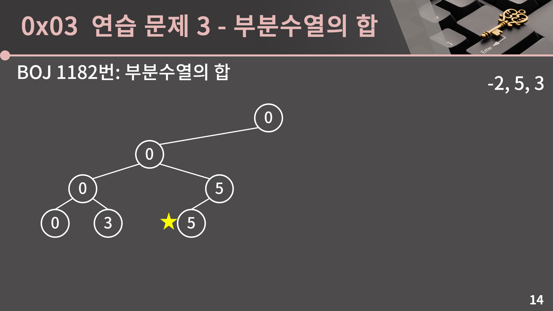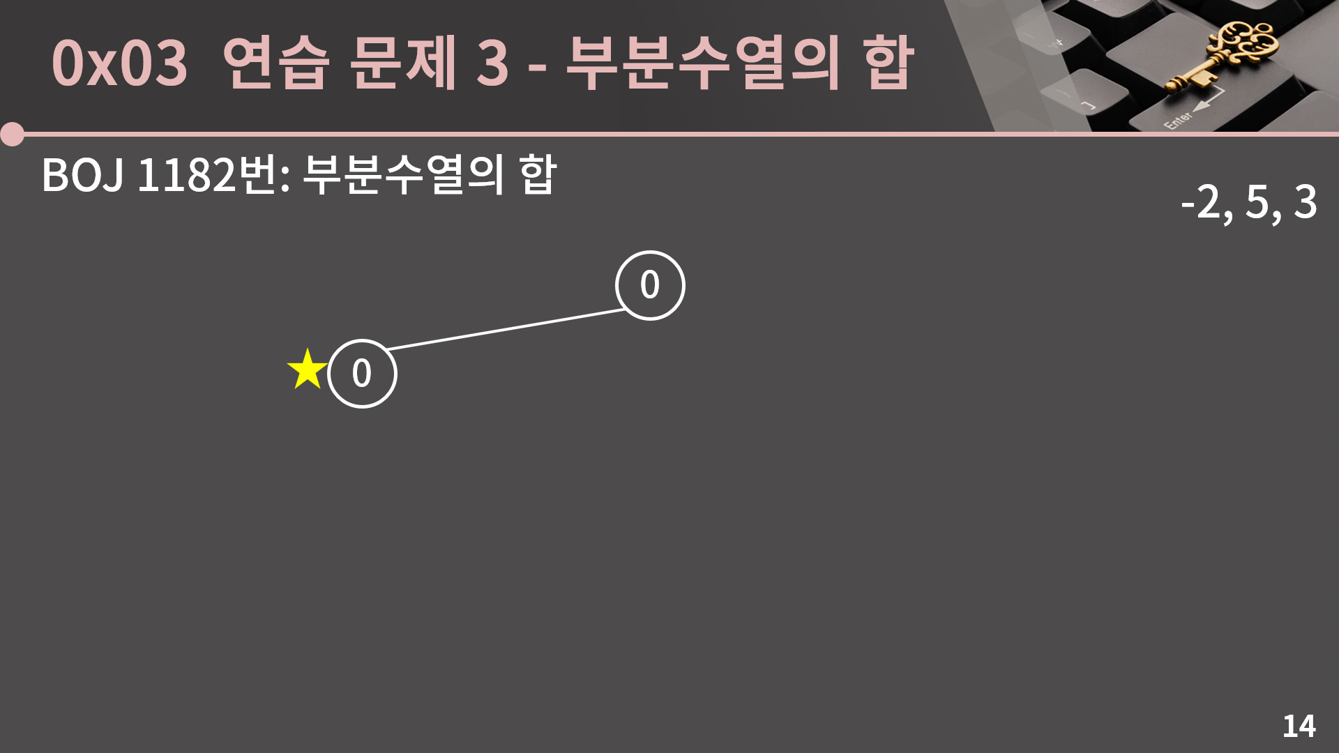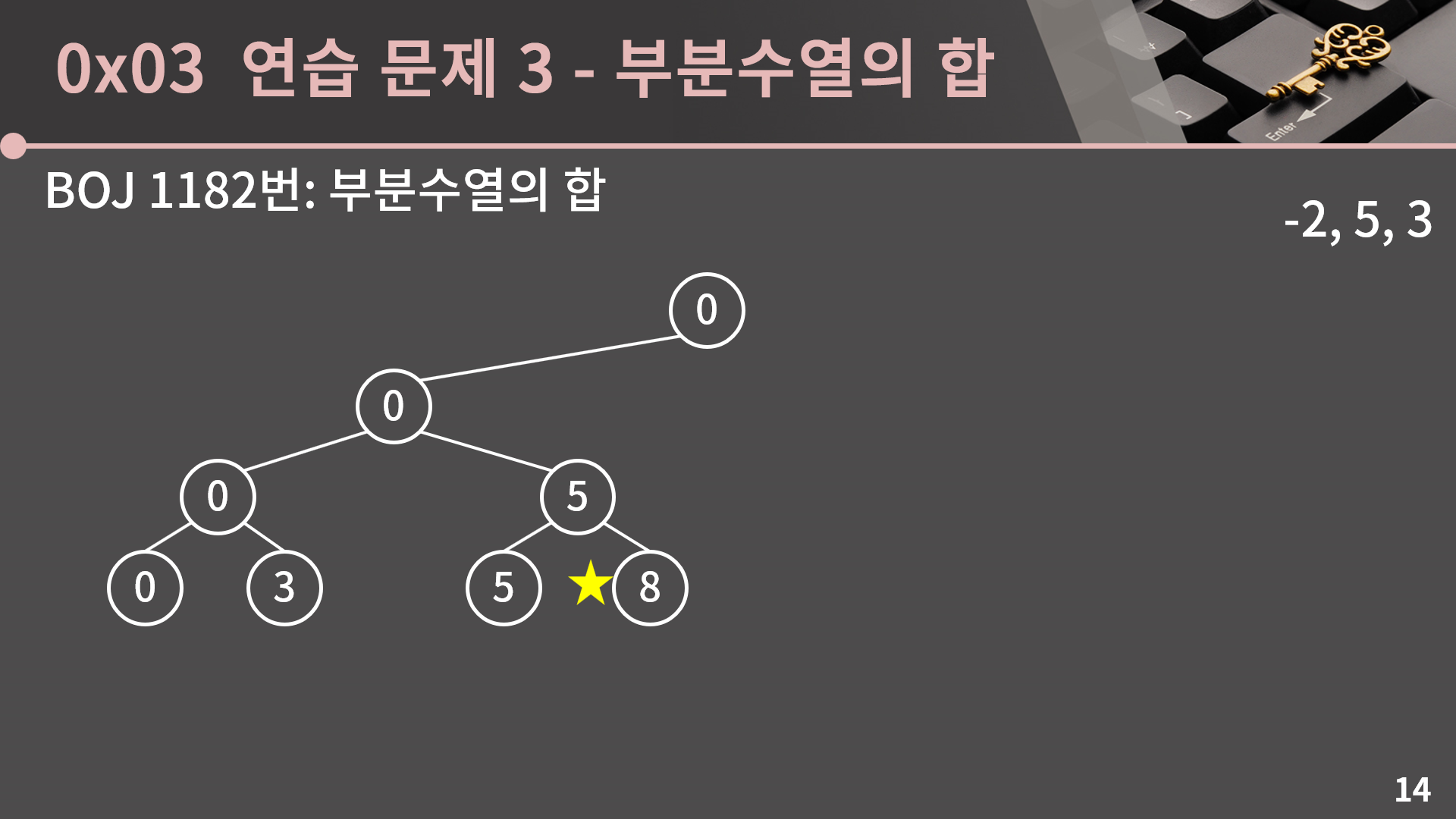 이렇게 우리는 3개의 수를 더할지말지 다 정했고 합 0을 얻었습니다. 3개의 수를 다 더하지 않았으니 지금의 상태는 공집합에 대응됩니다.
