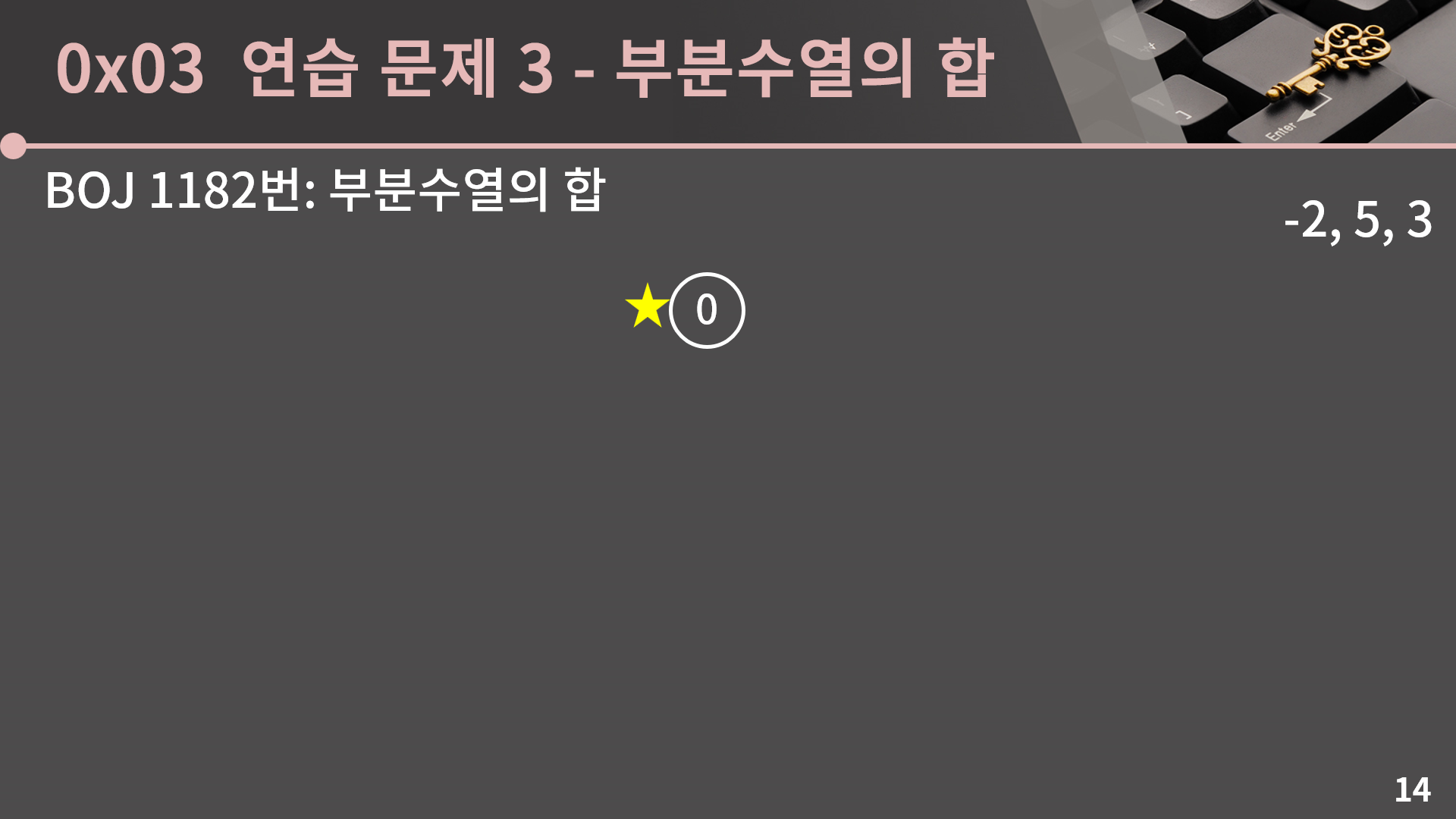 실제 구현을 할 때에는 함수의 인자로 현재까지의 합을 가져가게 했습니다. 그리고 문제에서 크기가 양수인 부분수열만 센다고 했으니 공집합은 제외를 해줘야 하는데 s가 0이 아닐 때에는 상관이 없고 s가 0일 때에는 cnt에서 1을 빼줘야 합니다.(코드)