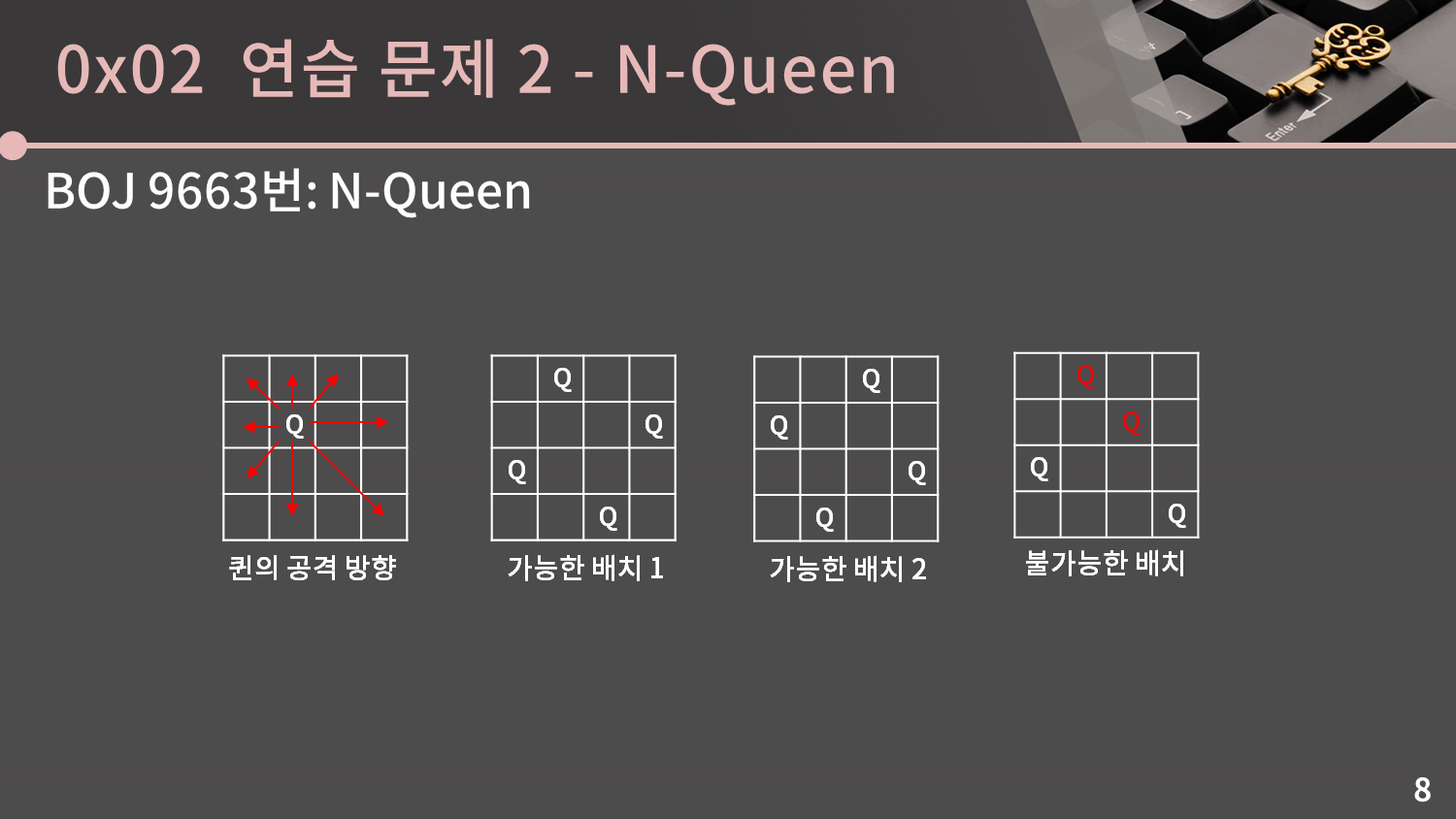 두 번째 문제는 N-Queen 문제입니다(BOJ 9663번: N-Queen). 이 문제는 N × N 체스판에 퀸 N개를 서로 공격하지 못하는 위치에 놓는 경우의 수를 구하는 문제입니다. 퀸은 체스판 위에서 상하좌우와 대각선으로 공격할 수 있는 기물이고 N = 4일 때를 예로 들면 슬라이드 상의 저 2가지 배치가 가능한 배치입니다. 오른쪽의 배치는 빨간색으로 칠한 퀸 2개가 서로를 대각선으로 공격할 수 있는 위치에 있기 때문에 불가능한 배치입니다. 문제의 N 제한이 14 이하로 굉장히 작기 때문에 이 문제는 백트래킹으로 해결할 수 있습니다.