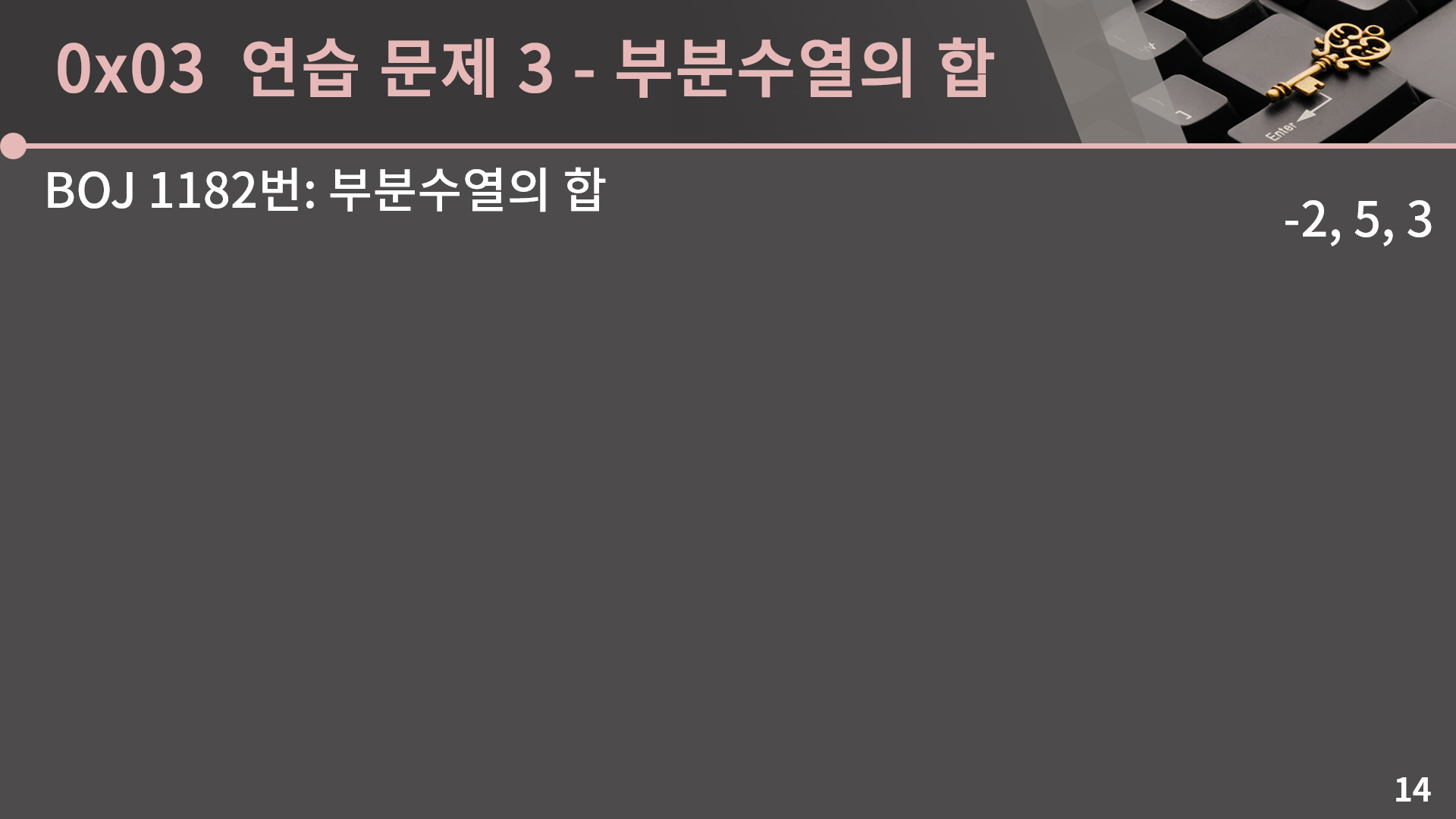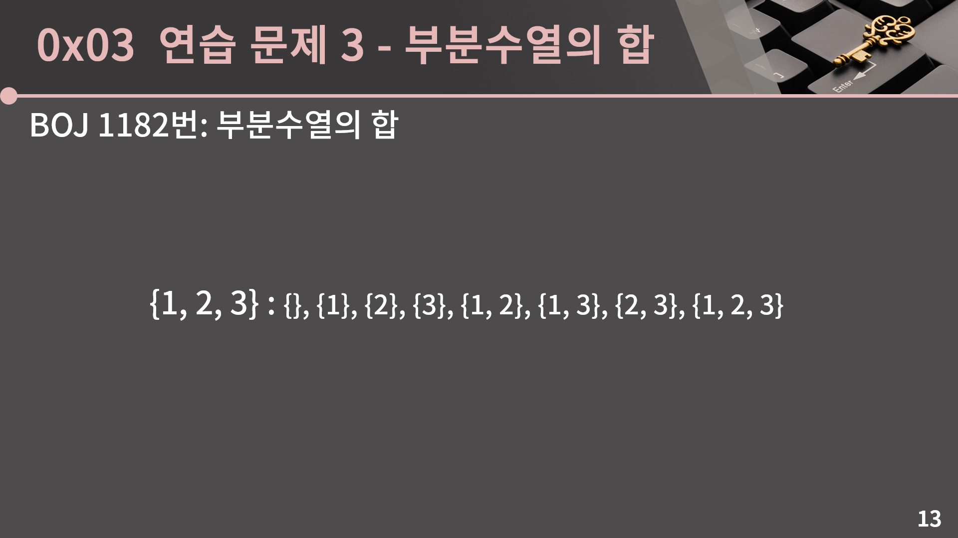 이렇게 매 순간 수를 더할지 더하지 않을지 선택하는 방법으로 모든 부분 수열의 합을 뽑아낼 수 있습니다. 이제 이 값을 S와 비교해주면 끝입니다. 다음 슬라이드에서 코드를 같이 보겠습니다.