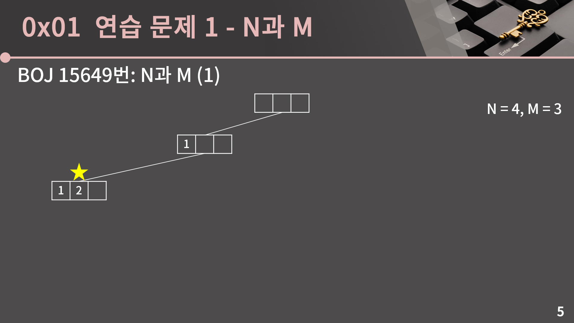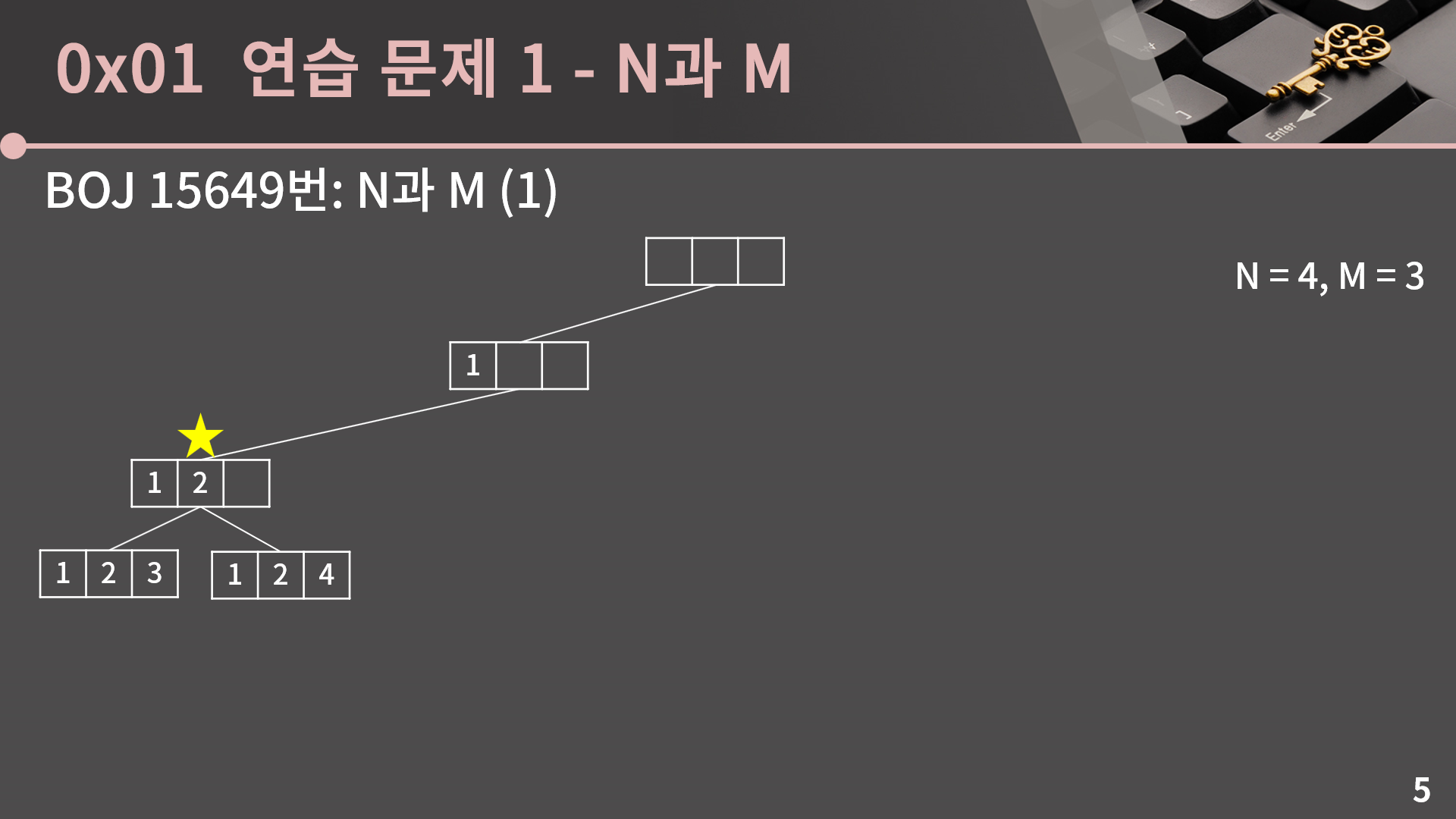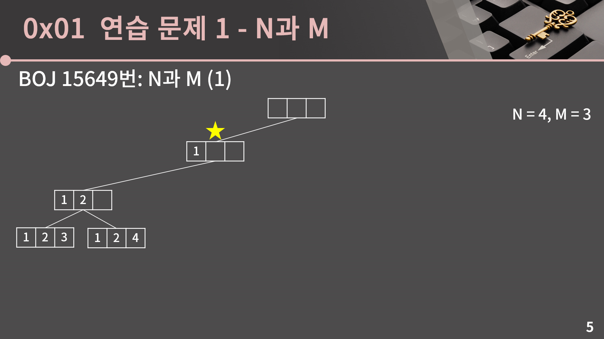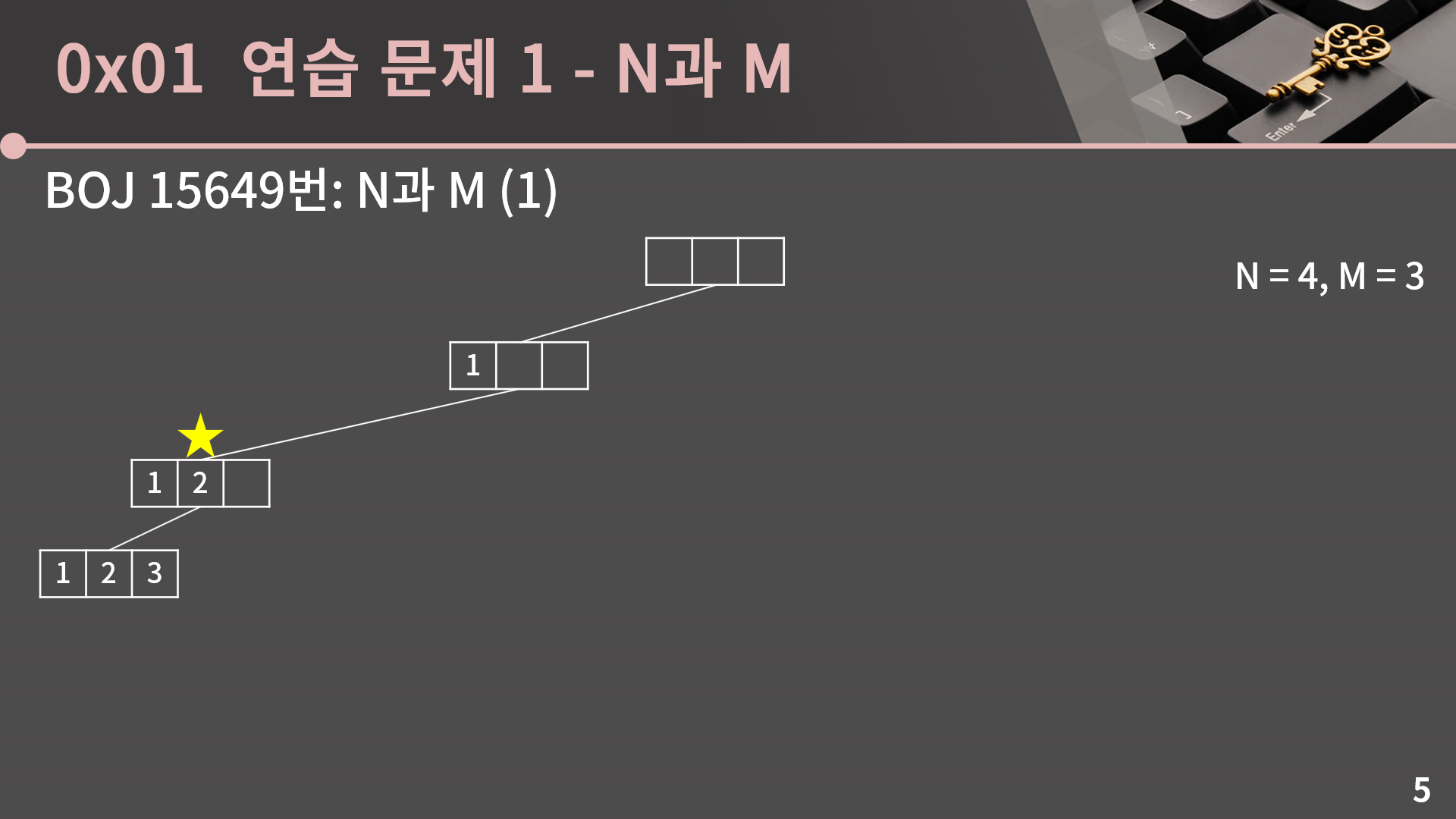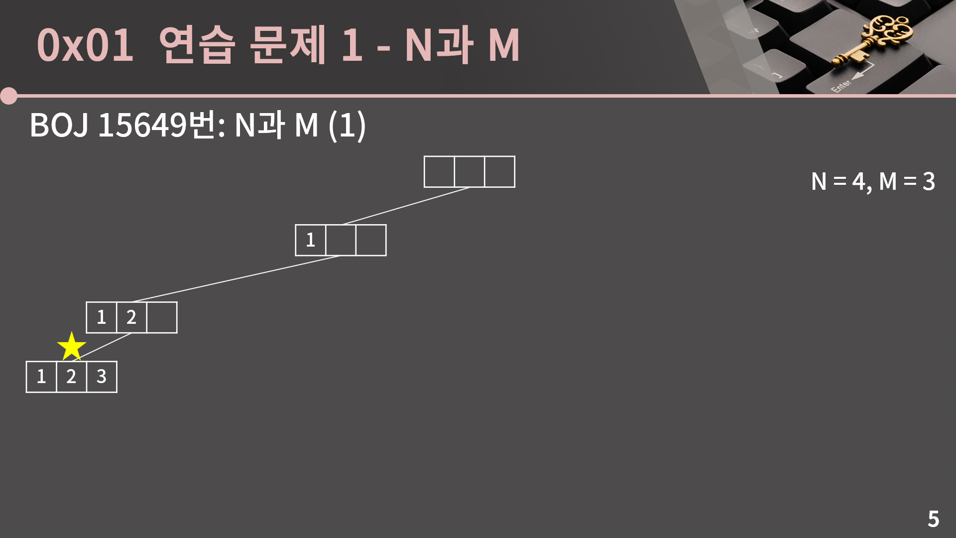제 생각에 15 ~ 22번째 줄이 백트래킹의 핵심이면서 한편으로는 재귀에 어느 정도 익숙하다고 해도 정말 헷갈릴 파트입니다. 다음 슬라이드에서 n = 4, m = 3일 때를 예시로 들어 다시 설명을 드리긴 하겠지만 이해가 안간다면 함수의 중간 중간 arr, isused, k를 출력한다던가 하는 방식으로 동작 원리를 세밀하게 들여다보시고, 그래도 헷갈리는게 있다면 100% 이해하려고 하기 보다는 이 기본 틀을 바탕으로 n과 m 시리즈들을 풀어보면 자연스럽게 체화될 수도 있습니다.