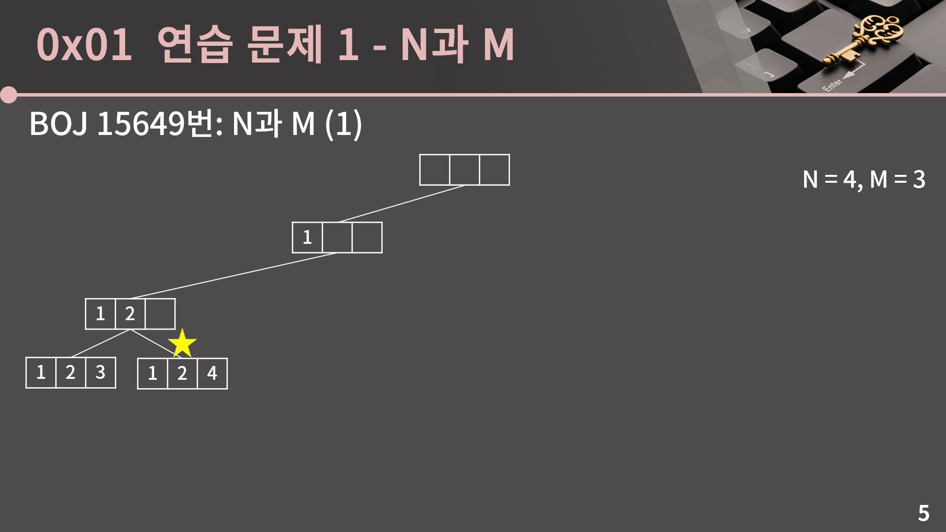 공간이 좁은 관계로 여기까지만 설명을 하겠습니다. 보면 동작 흐름은 크게 어렵지 않게 이해가 갈 것 같습니다. 상태라는 개념이 들어가서 그렇지 그냥 문제라고 생각하지 말고 종이에 1부터 4까지 자연수 중에서 중복 없이 3개를 고른 수열을 쭉 나열한다고 해보면 분명 지금 우리가 같이 한 것과 비슷한 흐름을 머릿 속에서 생각할 것입니다.