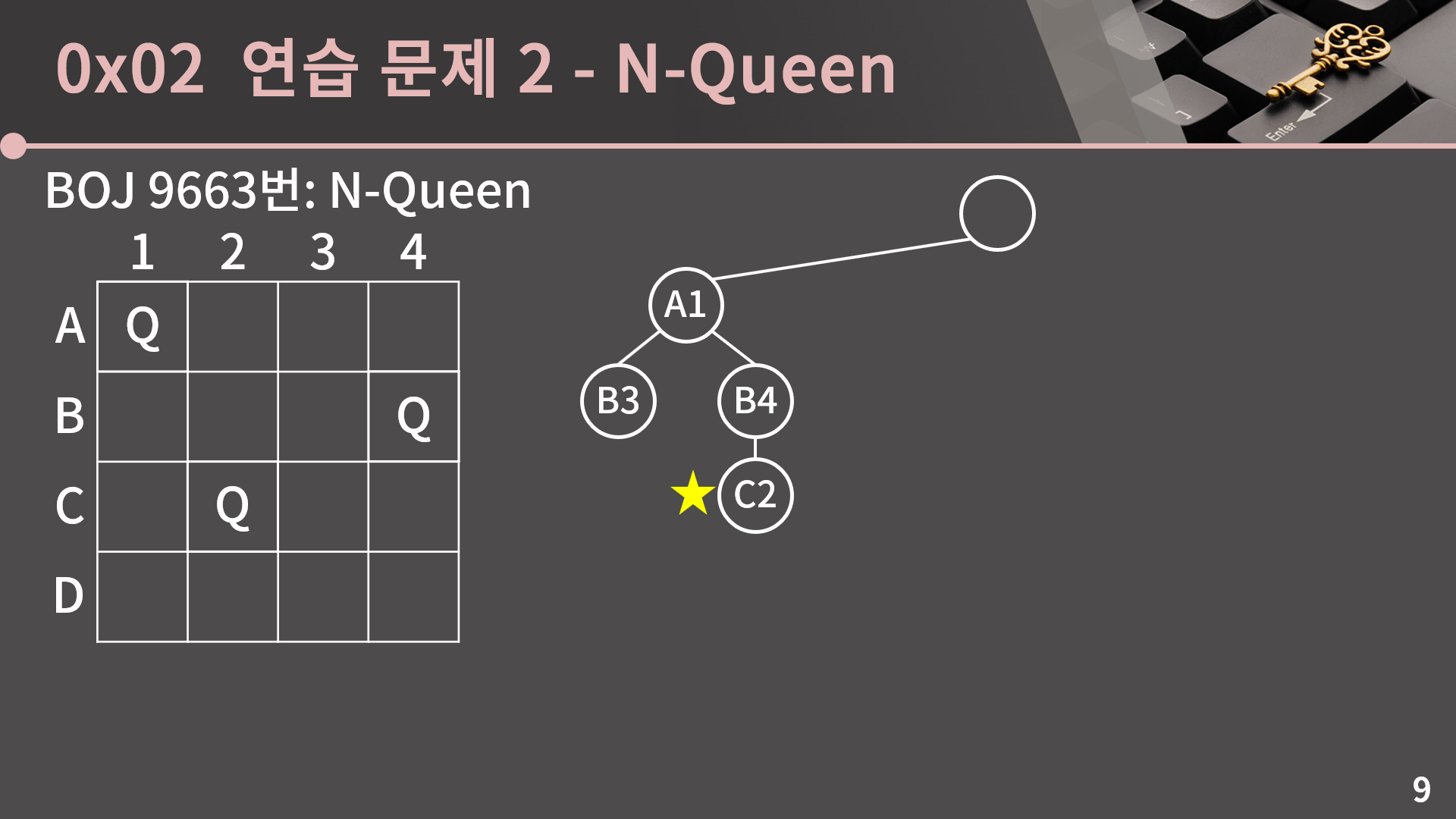 B4에 놓으면 C행에서 C2만 유일하게 퀸을 둘 수 있는 곳이니 C2에 퀸을 두겠습니다.