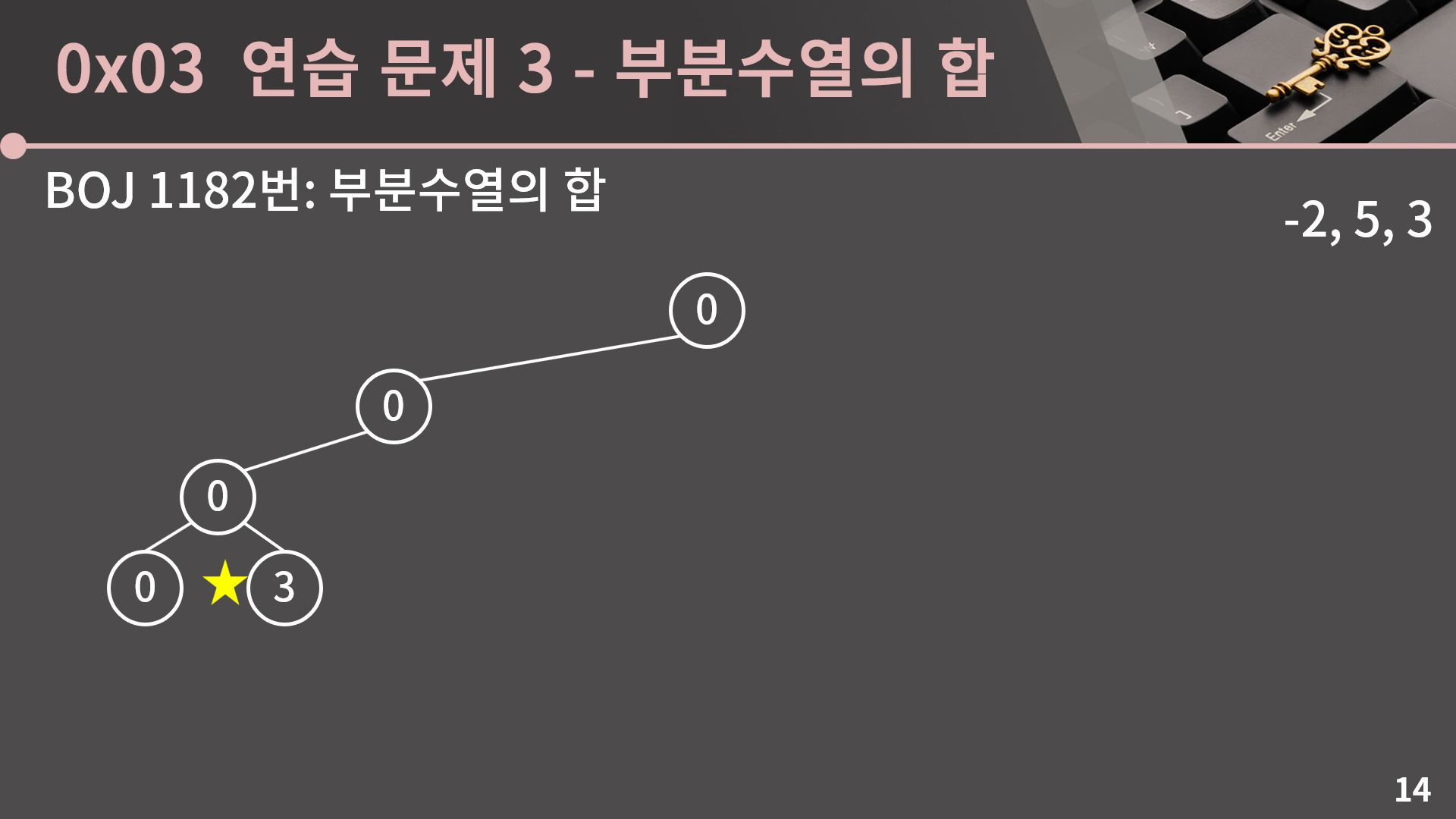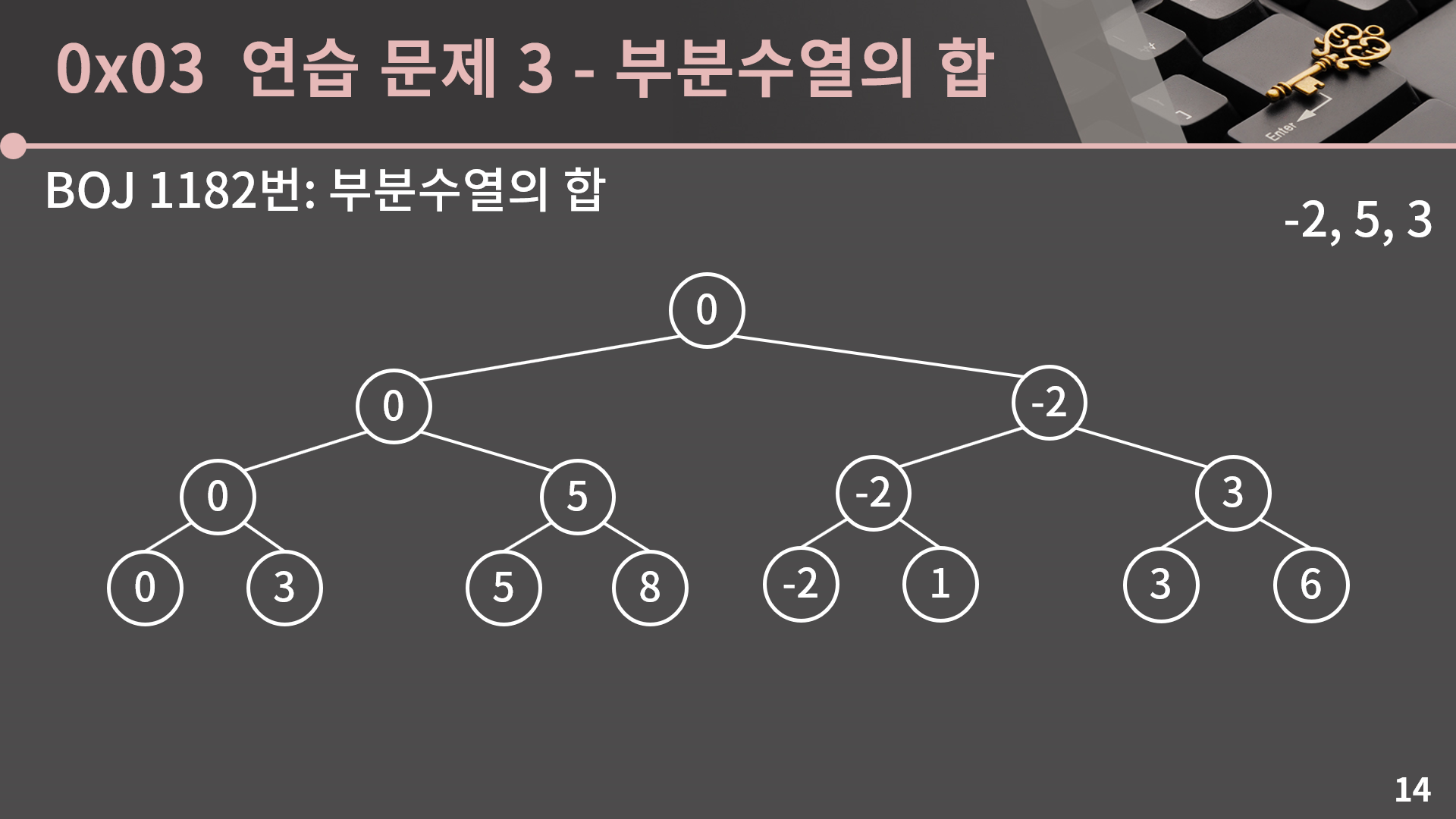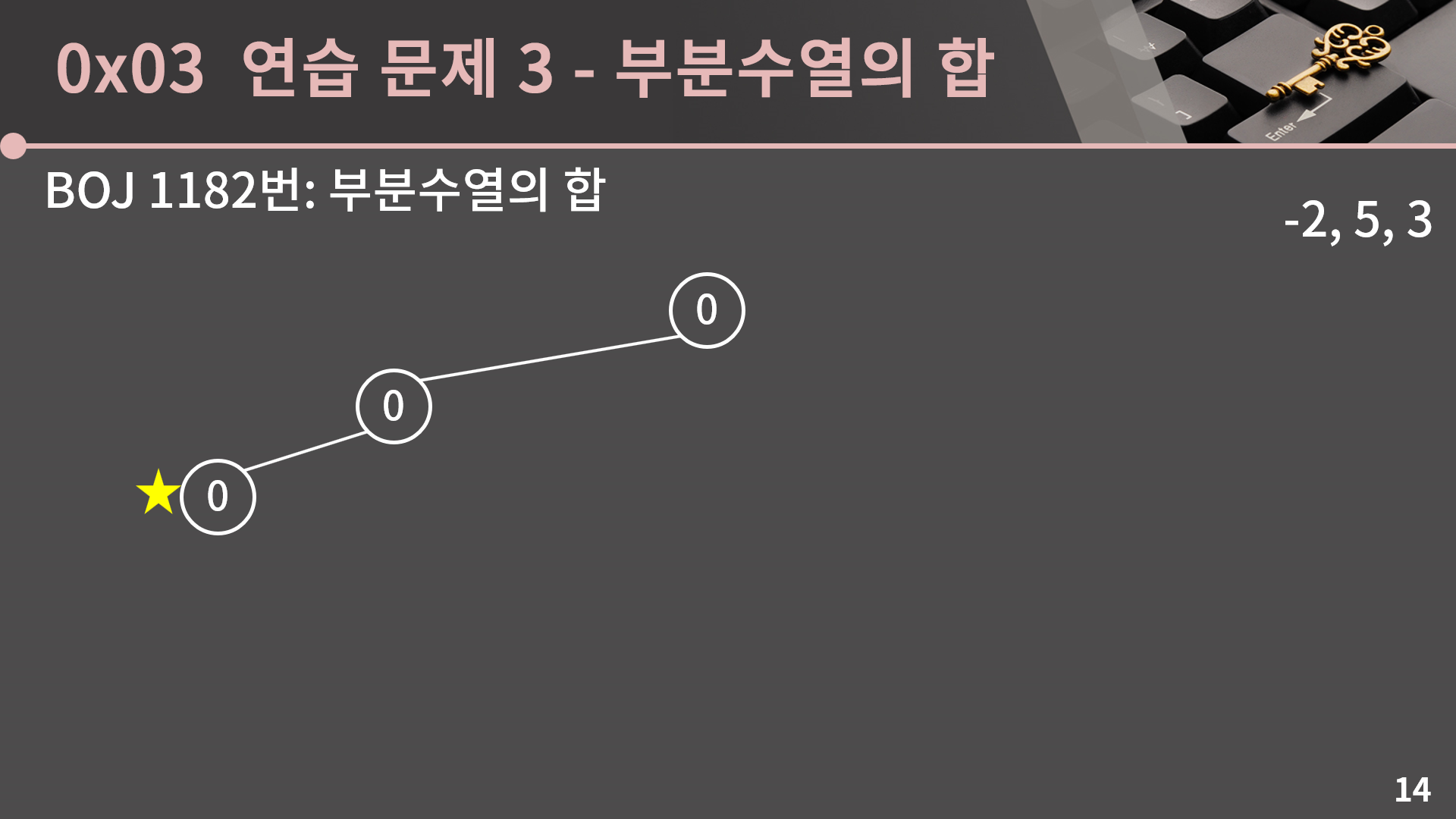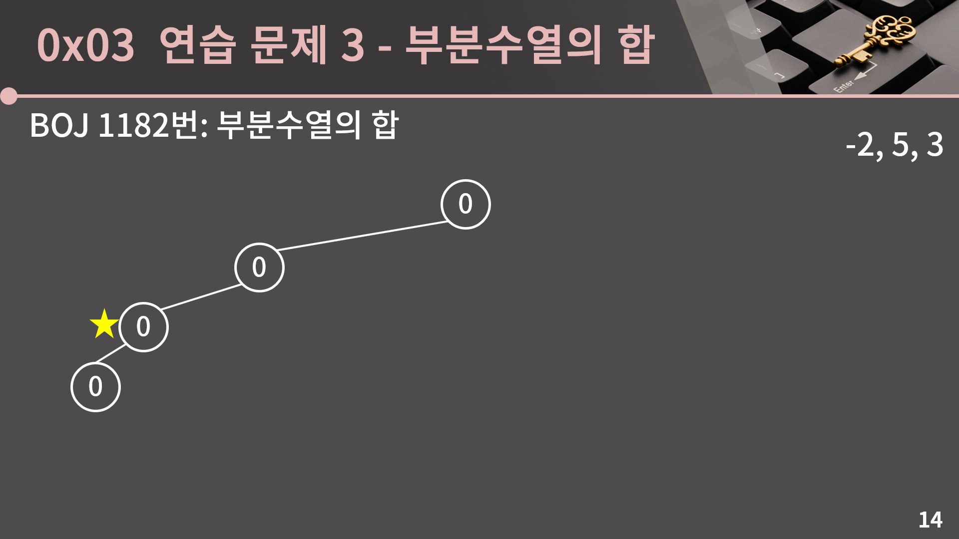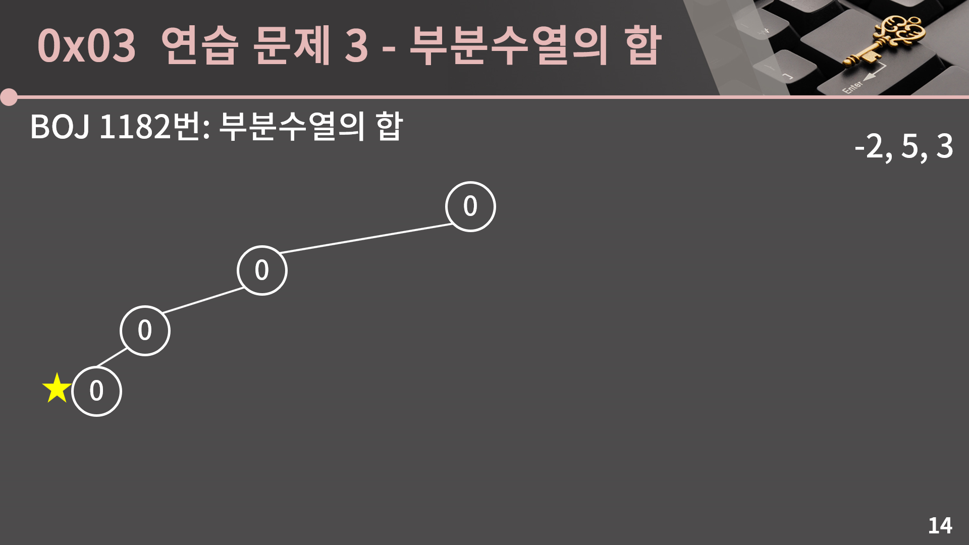 이렇게 우리는 3개의 수를 더할지말지 다 정했고 합 0을 얻었습니다. 3개의 수를 다 더하지 않았으니 지금의 상태는 공집합에 대응됩니다.