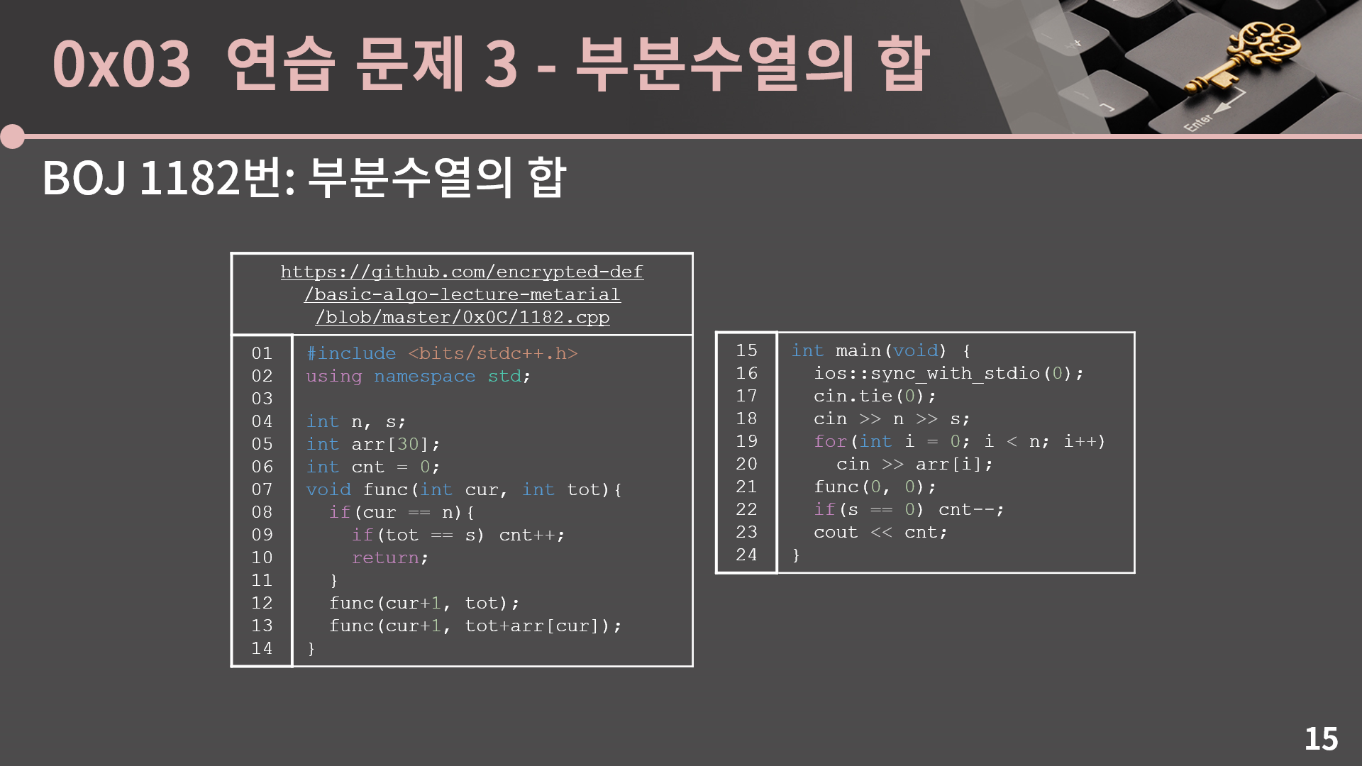 실제 구현을 할 때에는 함수의 인자로 현재까지의 합을 가져가게 했습니다. 그리고 문제에서 크기가 양수인 부분수열만 센다고 했으니 공집합은 제외를 해줘야 하는데 s가 0이 아닐 때에는 상관이 없고 s가 0일 때에는 cnt에서 1을 빼줘야 합니다.(코드)