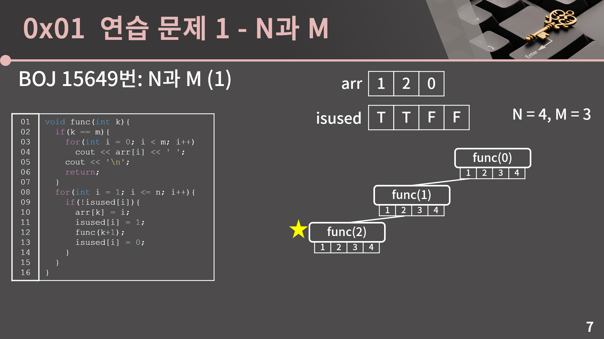 그 다음으로 재귀함수인데 이 함수 func(k)는 현재 k개까지 수를 택한 상황에서 arr[k]를 정하는 함수입니다. 맨 처음에는 수를 한 개도 택하지 않았으니 func(0)을 호출할거고 func(0)은 arr[0]을 정한 후에 func(1)을 호출합니다. arr 배열이 0-indexed인걸 놓치면 코드를 따라가다가 중간에 헷갈릴 수 있어서 잘 기억하고 계속 따라오시면 됩니다. func이 재귀 함수이니 당연히 base condition이 필요하고, k = m이 되었을 때 m개를 모두 택했으니 수열을 출력한 후 함수를 종료하면 된다는 것을 알 수 있습니다. 만약 k가 m이 아니라면 if문을 건너뛰어 15번째 줄로 넘어오고 여기서는 1부터 n까지 수를 차례로 확인하며 아직 쓰이지 않은 수를 찾아냅니다. !isused[i]에서 !은 논리 NOT이니까 isused[i]가 false일 때 if문이 참이 되고 arr[k] = i, isused[i] = true로 만든 후 func(k+1)을 호출합니다. 그 후 20번째 줄에 도착했다는건 arr[k] = i로 둔 상태에서 func(k+1)에 들어갔다가 모든 과정을 끝냈다는 얘기이니 isused[i] = false로 되돌려 수 i가 사용되지 않고 있음을 명시합니다. 단 현재 값이 i인 arr[k]는 굳이 0과 같은 값으로 변경할 필요가 없는데 어차피 자연스럽게 다른 값으로 덮힐 예정이라 그렇습니다.
