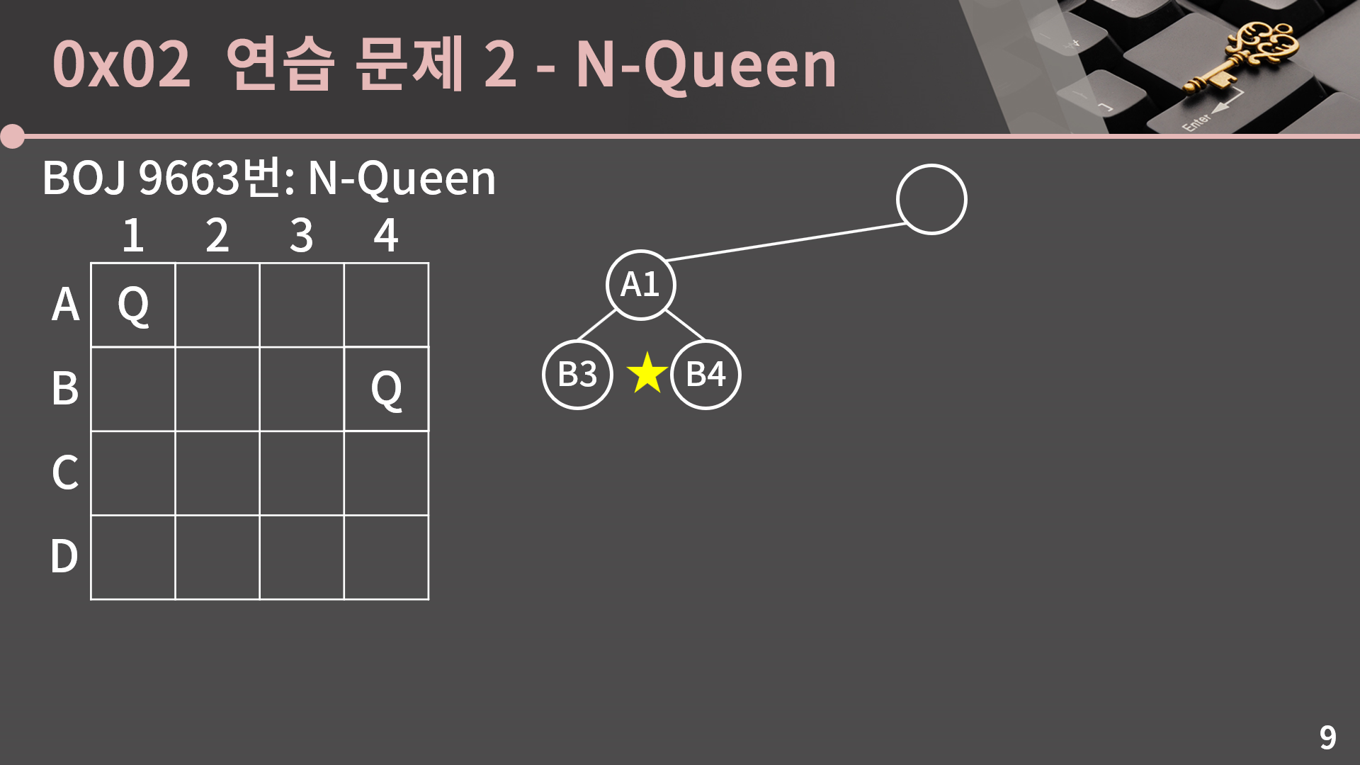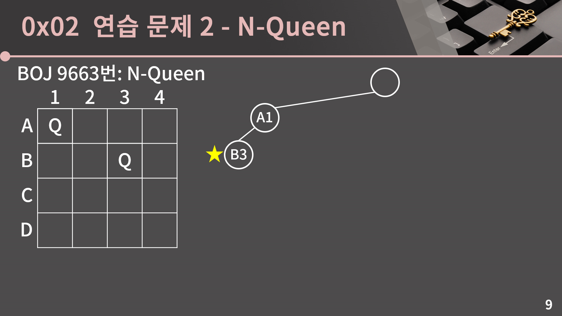 이제 B행에 퀸을 둘 차례인데 A1에 퀸을 뒀으니 자연스럽게 B1과 B2에는 퀸을 둘 수 없고 가능한 곳은 B3 혹은 B4입니다. B3에 퀸을 두겠습니다.
