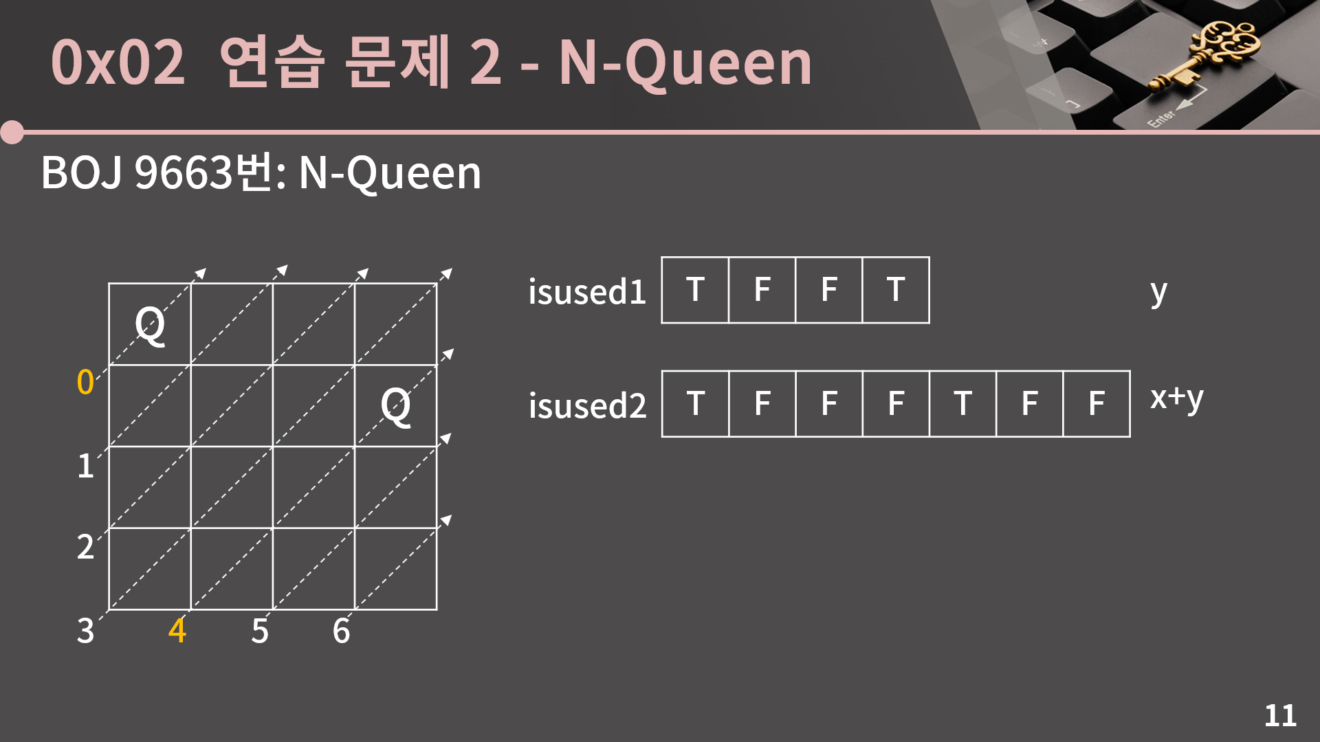 isused1은 열에 대응되는 값으로, (x, y)에 퀸이 있으면 isused1[y]를 true로 만들면 됩니다.