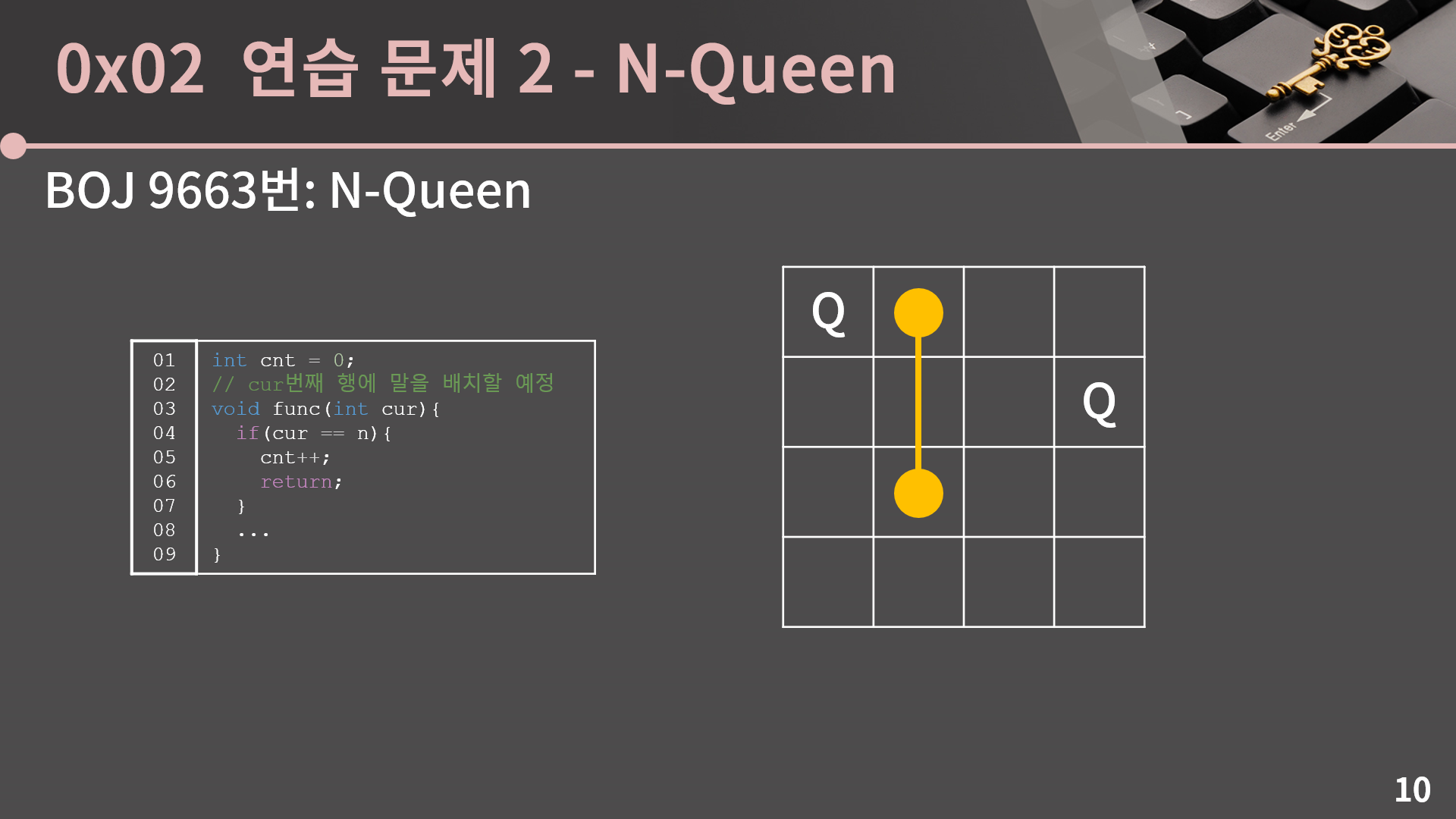 일단 함수의 기본 틀은 이렇게 생겼습니다. func(0)을 호출해 0번째 행에 퀸을 배치하고 func(0)은 func(1)을 호출하고, 이렇게 진행하다가 func(n)이 호출되면 퀸 n개를 놓는데 성공했다는 의미이니 cnt를 1 증가시킵니다. 여기까지는 좋은데 이 문제에서 가장 어려운 부분은 특정 좌표에 퀸을 둘 수 있는지를 어떻게 판단할 것인가 하는 문제입니다.