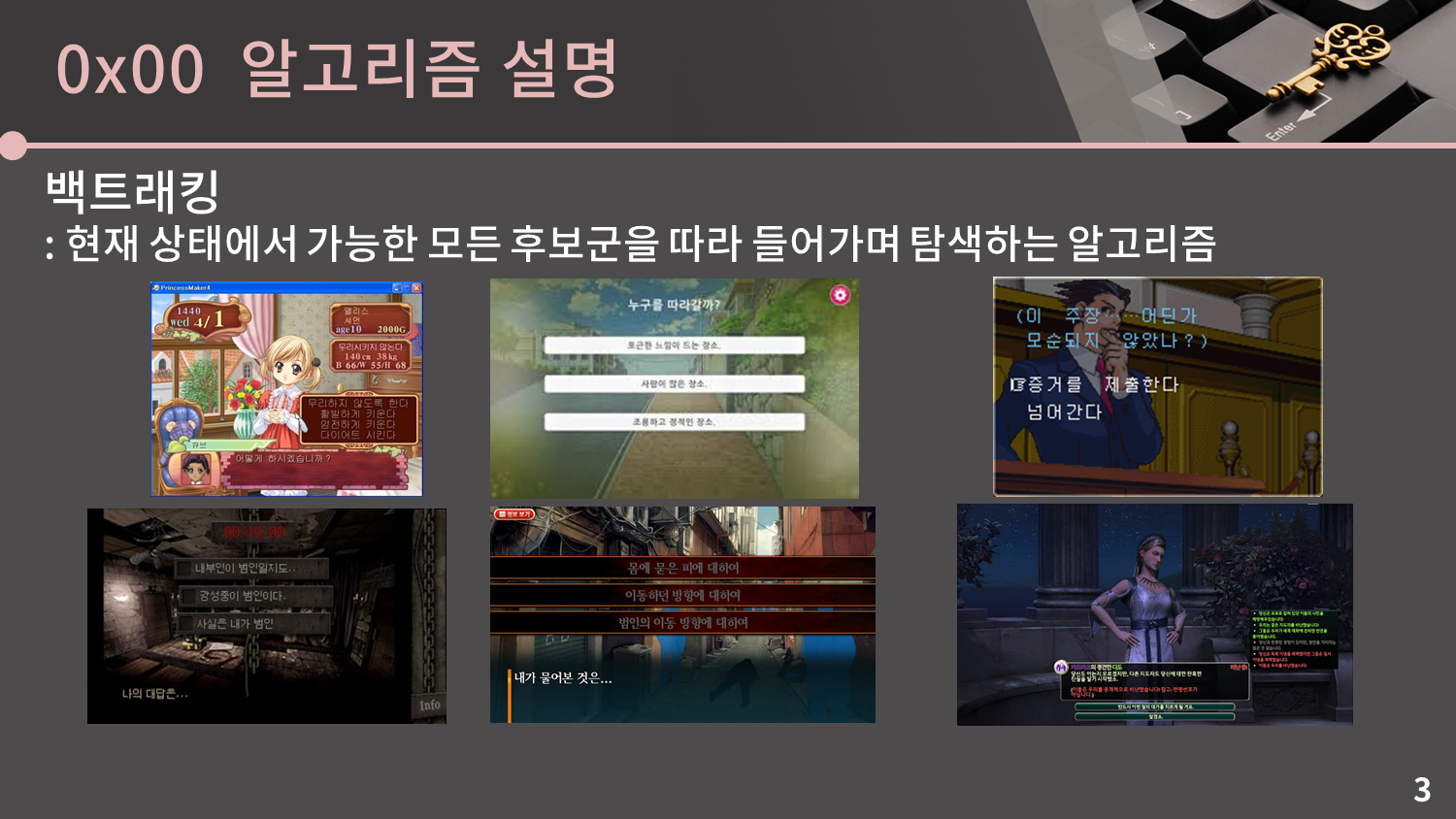 왼쪽 위부터 차례로 프리세스 메이커, 게임 이름은 모르겠는데 아무튼 미연시, 역전 재판, 검은방, 회색도시, 문명입니다. 참고로 저는 미연시는 해본적 없습니다. 미연시가 너무 적절한 예시라 넣은 것 뿐이니 오해하지 말아주시고, 이렇게 게임에서 선택지가 막 나누어질 때 저희는 뭔가 하나를 정해서 가야합니다. 검은방 스샷을 가지고 얘기를 이어가보면 저 3가지 선택지 중에 첫 번째를 선택했더니 게임오버가 떴다고 해볼겠습니다. 그러면 되돌아와서 두 번째를 선택해볼꺼고, 두 번째도 이상하면 세 번째 것을 선택해보고 결론적으로 모든 경우를 다 훑어보게 될 것입니다. 즉 현재 상태에서 가능한 모든 선택지를 다 플레이해보는 방법이 바로 백트래킹입니다.