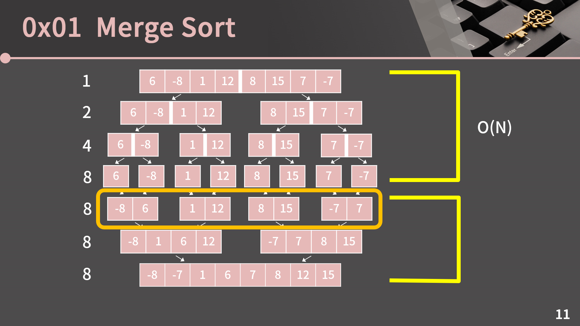 먼저 분할하는 부분은 나중에 코드를 보면 특별한 연산을 하는건 아닙니다. 그냥 함수 호출을 통해 관념적으로 분할되었다고 생각하는거고, 함수 호출의 횟수는 각 줄별로 1, 2, 4, …, 2k번입니다. 이 횟수는 각 줄에 리스트가 몇 개 있는지 보면 됩니다. 예를 들어 3번째 줄을 보면 리스트가 {6, -8}, {1, 12}, {8, 15} {7, -7} 총 4개 있고 각각에 대해 함수가 호출될테니 그 줄에서 함수는 4번 호출됩니다. 그러면 분할하는 과정에서 함수호출은 1+2+4+ … +2k = 2N - 1 = O(N)번 발생합니다. 즉 분할하는 과정의 시간복잡도는 O(N)입니다.
