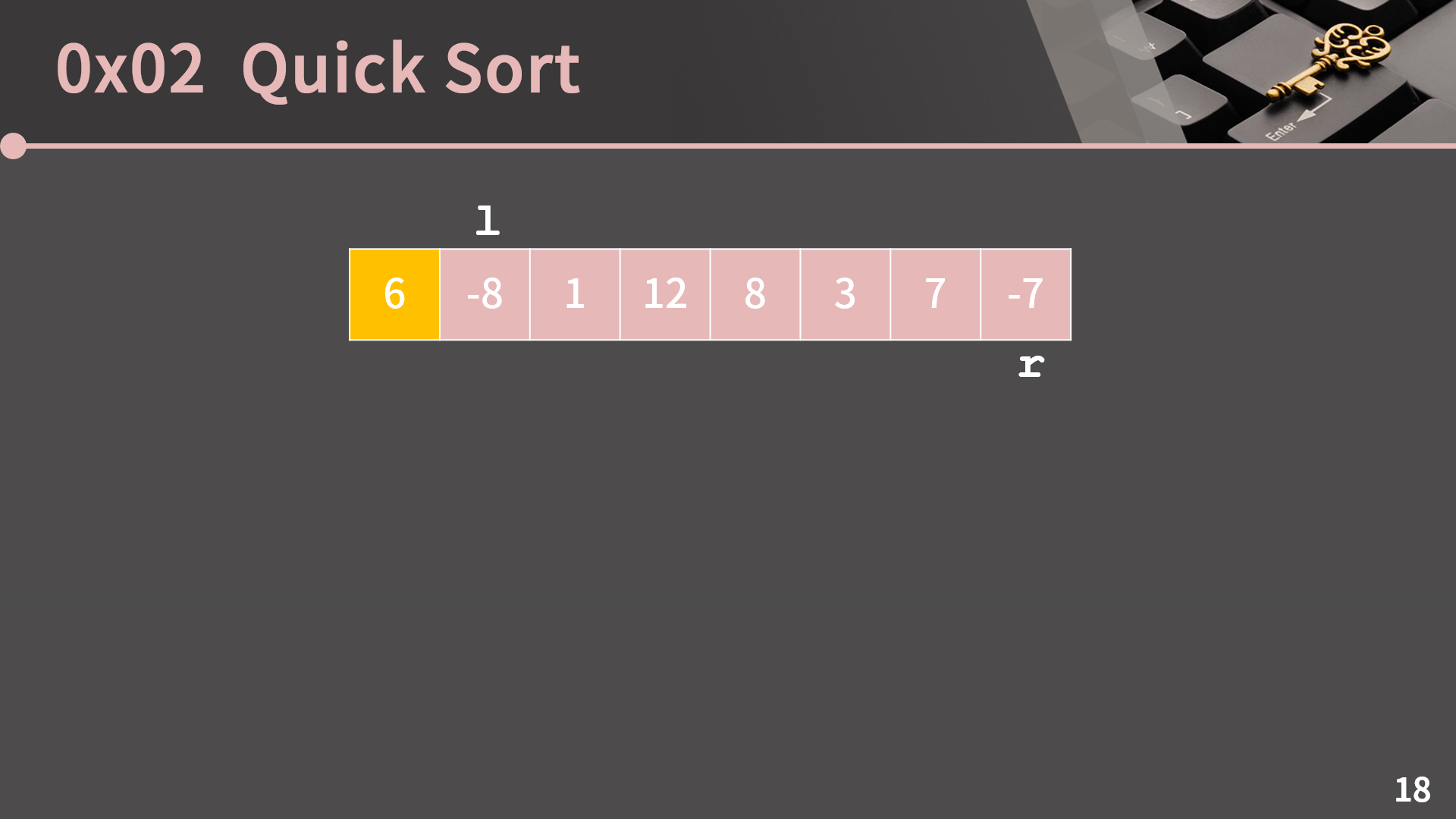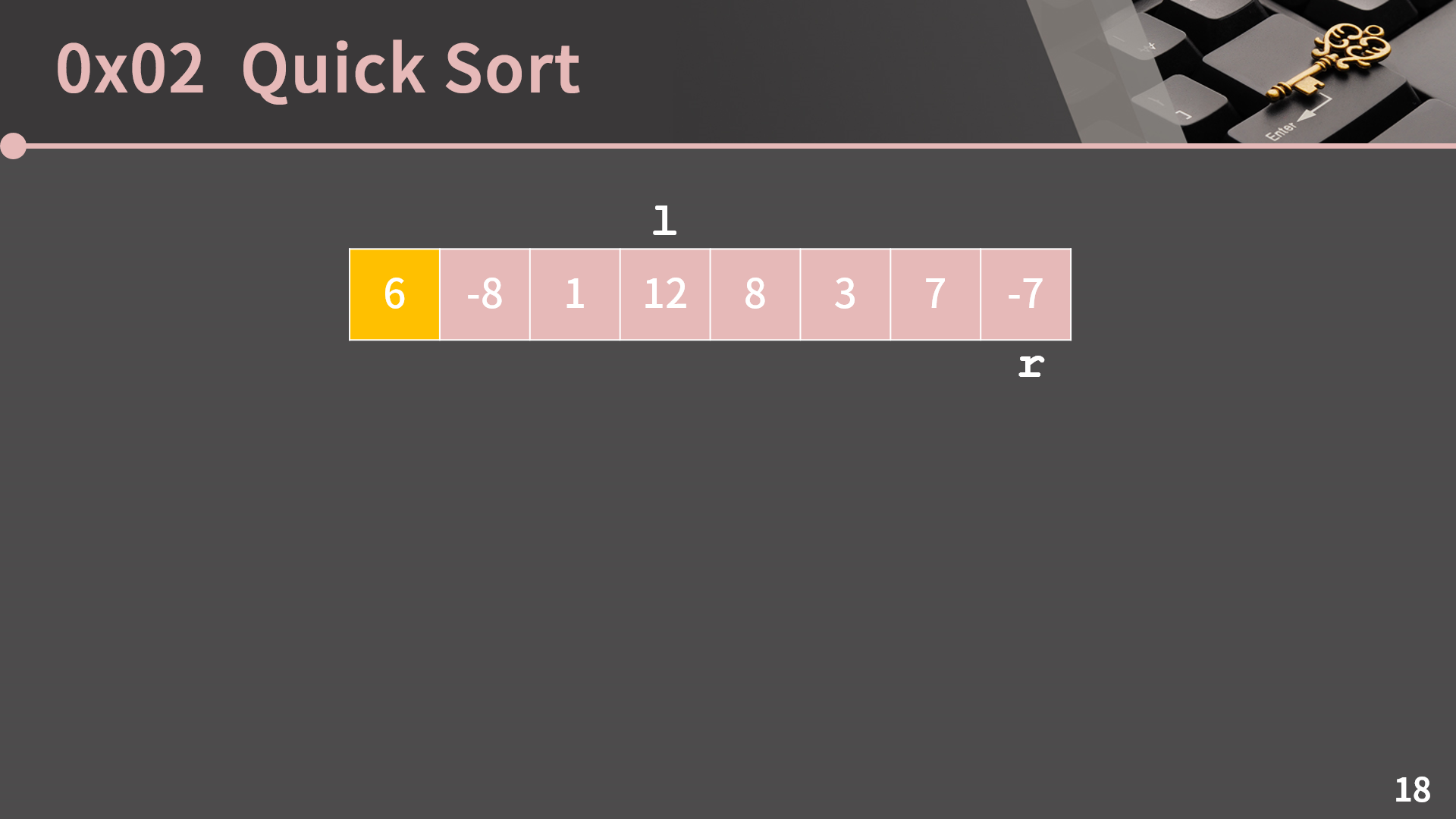 실제로 상황을 보면서 얘기해봅시다. 먼저 l을 pivot보다 큰 값이 나올 때 까지 오른쪽으로 이동하면 12에서 멈춥니다. 그 다음으로 r을 pivot보다 작거나 같은 값이 나올 때 까지 왼쪽으로 이동시킬텐데 애초에 지금 -7이 pivot보다 작으니 이동할 필요 없이 가만히 있으면 됩니다.