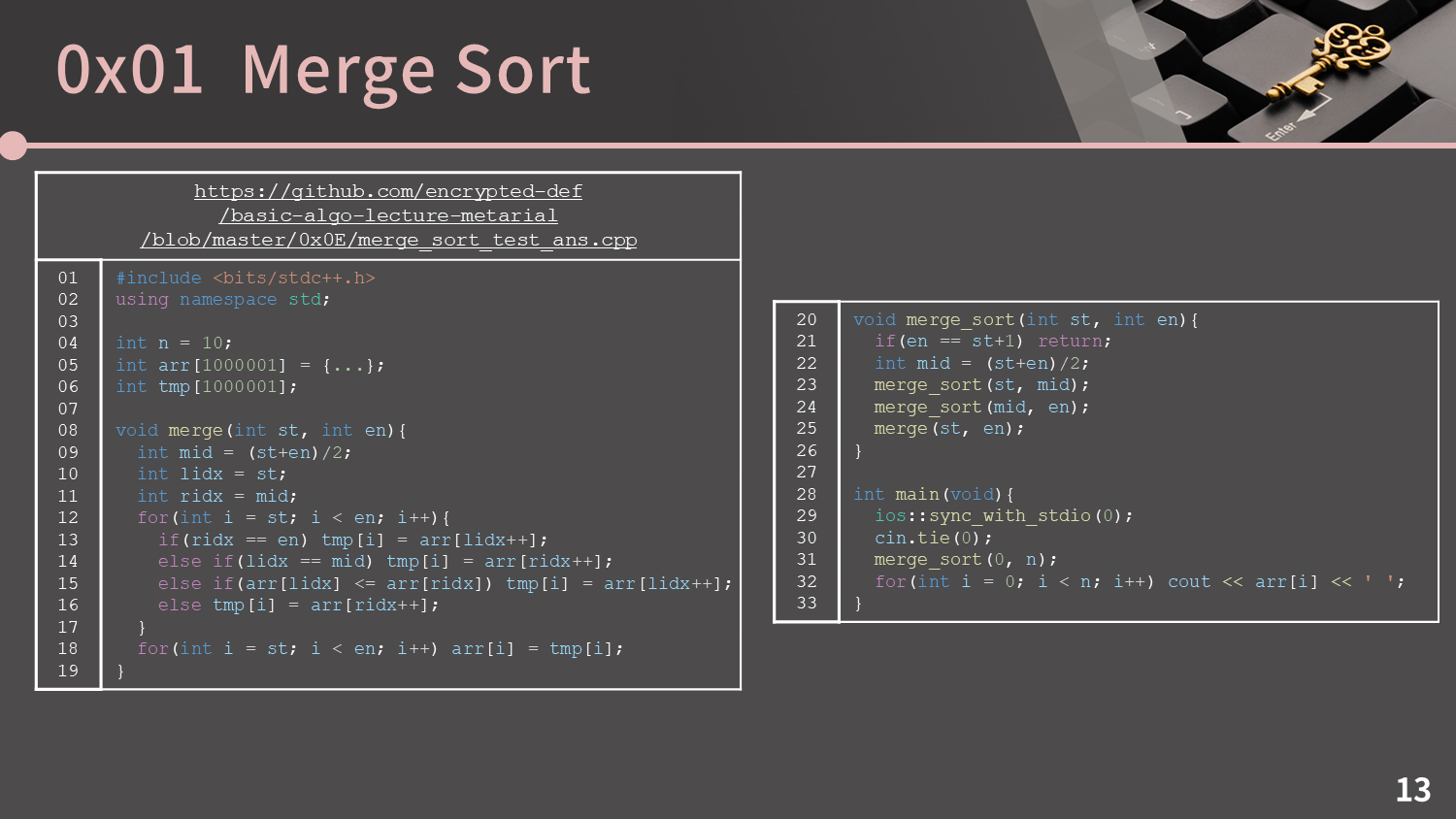 그리고 merge_sort 함수는 그냥 arr[st:en]을 정렬하는 함수입니다. 이 상황을 이해하고 나면 지금 이 코드가 앞 슬라이드에서 본 상황을 충실하게 따라가고 있다는걸 알 수 있습니다. 13번째 줄에서의 base condition은 알아서 처리를 하시고, 15, 16번째 줄에서 주어진 리스트를 2개로 나누고 각각 정렬합니다. 그 다음으로 17번째 줄에서 나눈 두 리스트를 합칩니다. 이제 설명은 다 됐고 구현을 해봅시다. 다 한다음에 실제 정렬이 잘 됐는지 확인해보면 됩니다. 다음 슬라이드에 바로 정답 코드가 나오니까 다 짜고 나서 넘어옵시다.