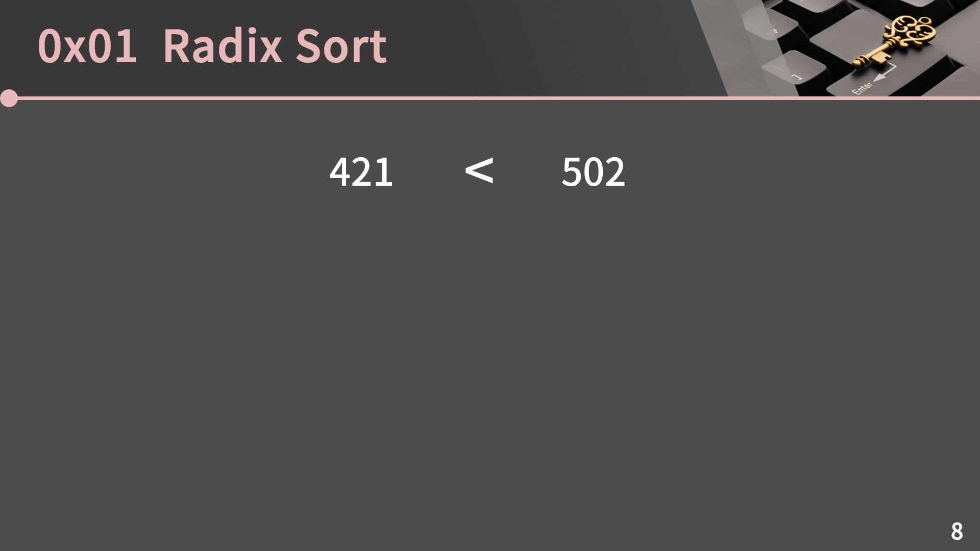 단원의 내용에 따르면 502과 421을 비교할 땐 먼저 100의 자리를 비교합니다. 502에서는 5이고 421에서는 4여서 502가 421보다 크다는걸 알 수 있습니다. 즉 우리가 수를 비교해서 수 A가 수 B보다 더 크다고 하는건 더 큰 자리에서 A의 자릿수가 B의 자릿수보다 큰 경우가 먼저 생긴다는 얘기입니다. 이걸 인지한 상태로 다시 라딕스 소트 과정을 보겠습니다.