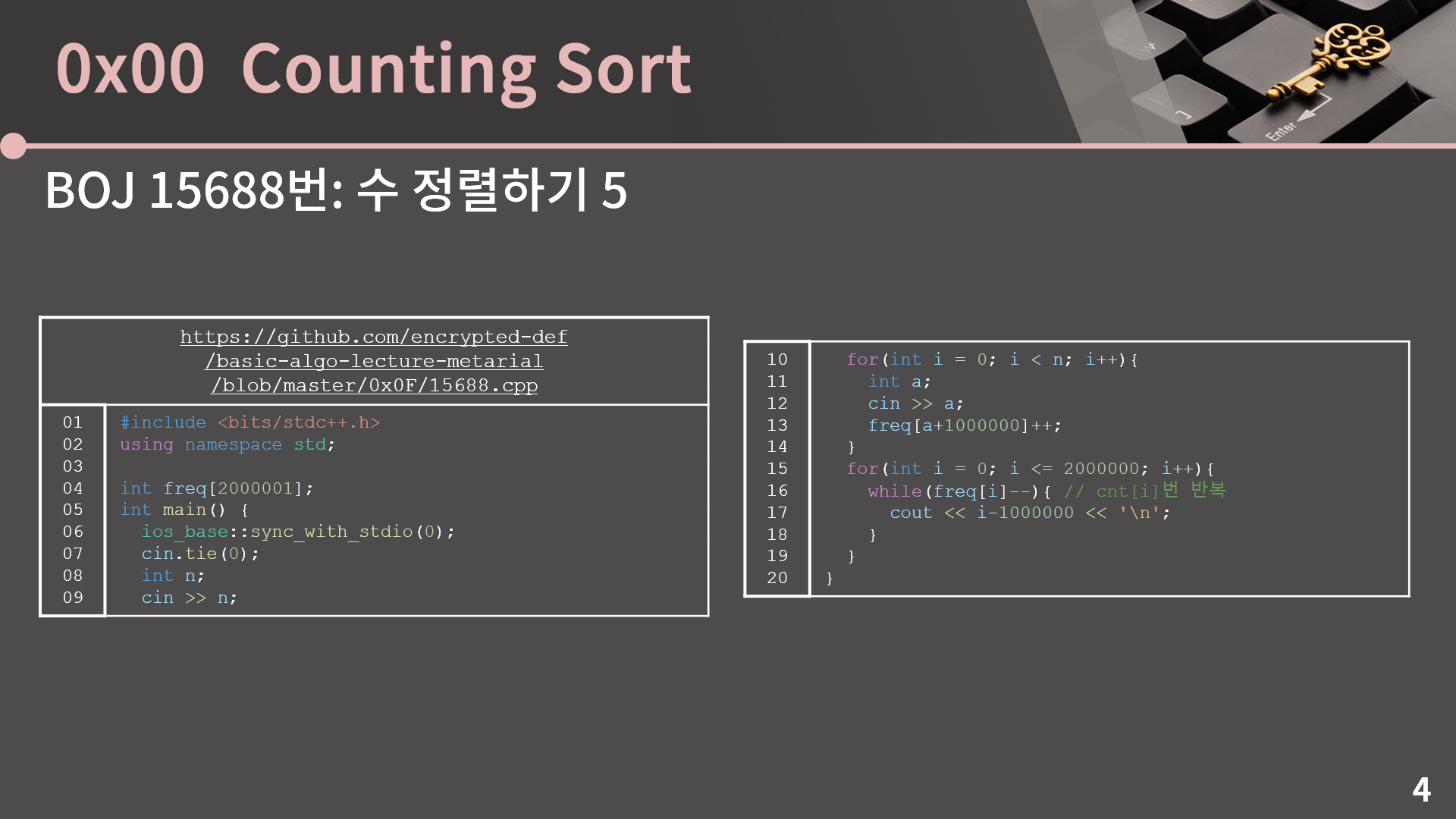 작성을 해보니 어떤가요? 아마 난이도가 그렇게 높지는 않다고 생각이 드는데 혹시 뭔가 꼬였더라도 너무 좌절하지는 마시고 제 코드를 같이 보겠습니다. 일단 수가 -1,000,000에서 1,000,000인게 껄끄러우니 freq 배열의 인덱스에 접근할 때에는 13번째 줄처럼 100만을 더했습니다. 그리고 freq 배열의 값을 보면서 수를 출력할 때에는 17번째 줄처럼 100만을 빼주면 됩니다. 카운팅 소트는 이게 다입니다.