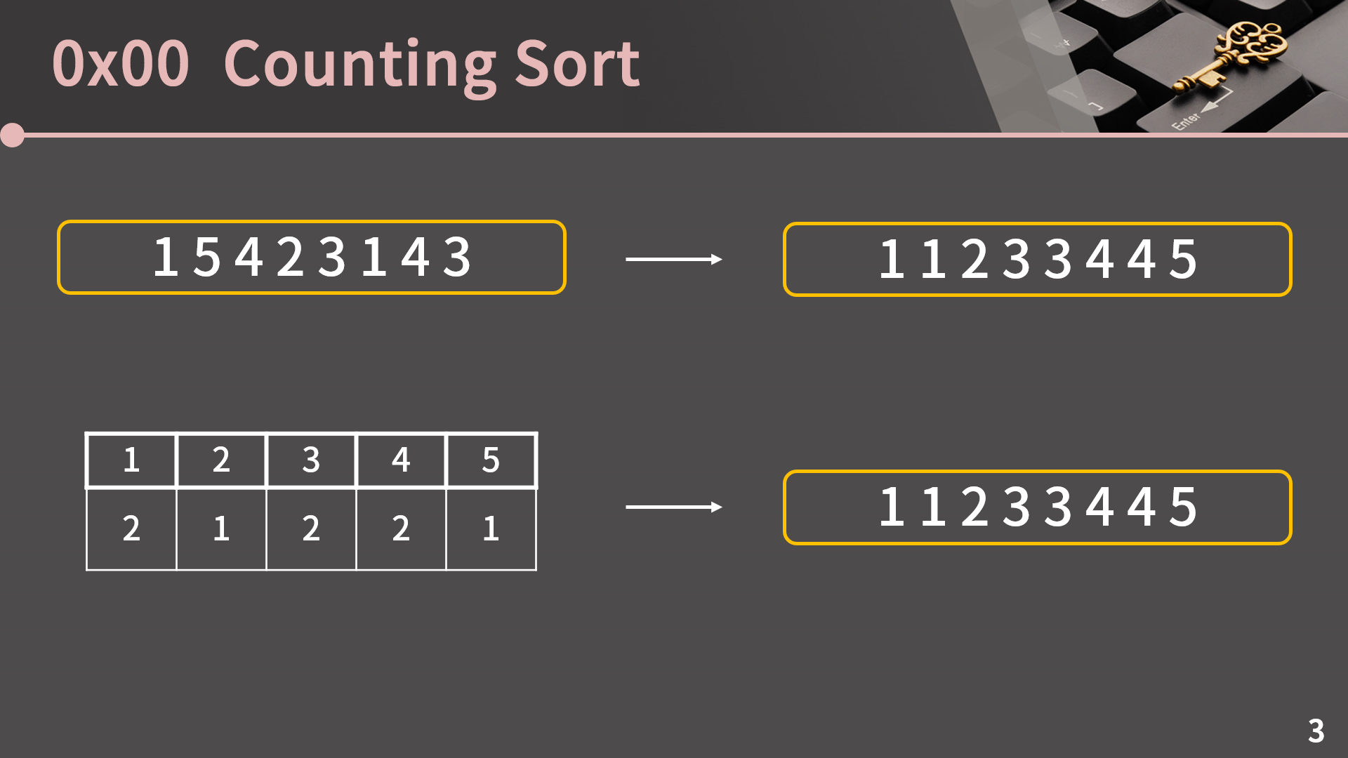 이 표만 있으면 정렬을 너무 쉽게 할 수 있는게, 그냥 1부터 차례로 나온 횟수만큼 적으면 끝입니다. 1이 2번 나왔으니 1을 2개 쓰고, 2는 1번이니 1개 쓰고, 이런식으로 하면 너무나 쉽게 정렬이 가능합니다.
