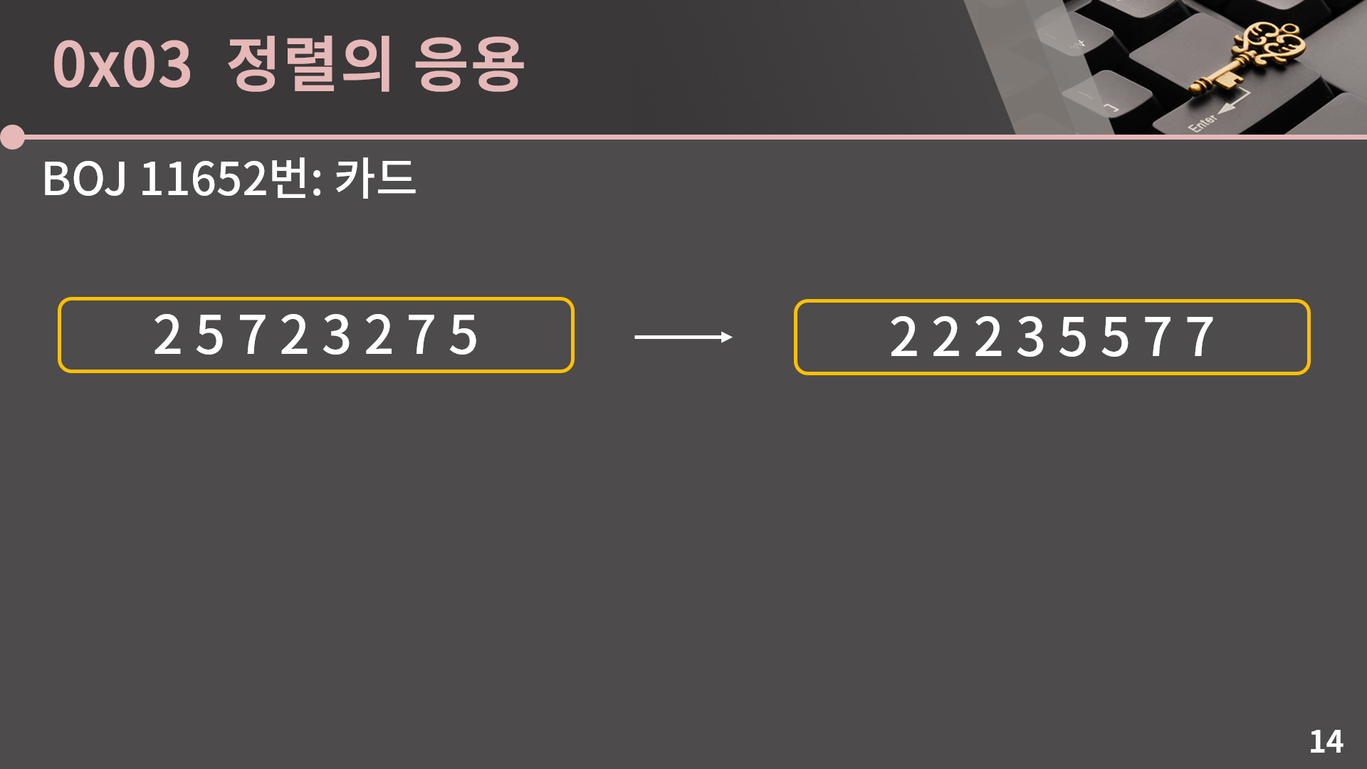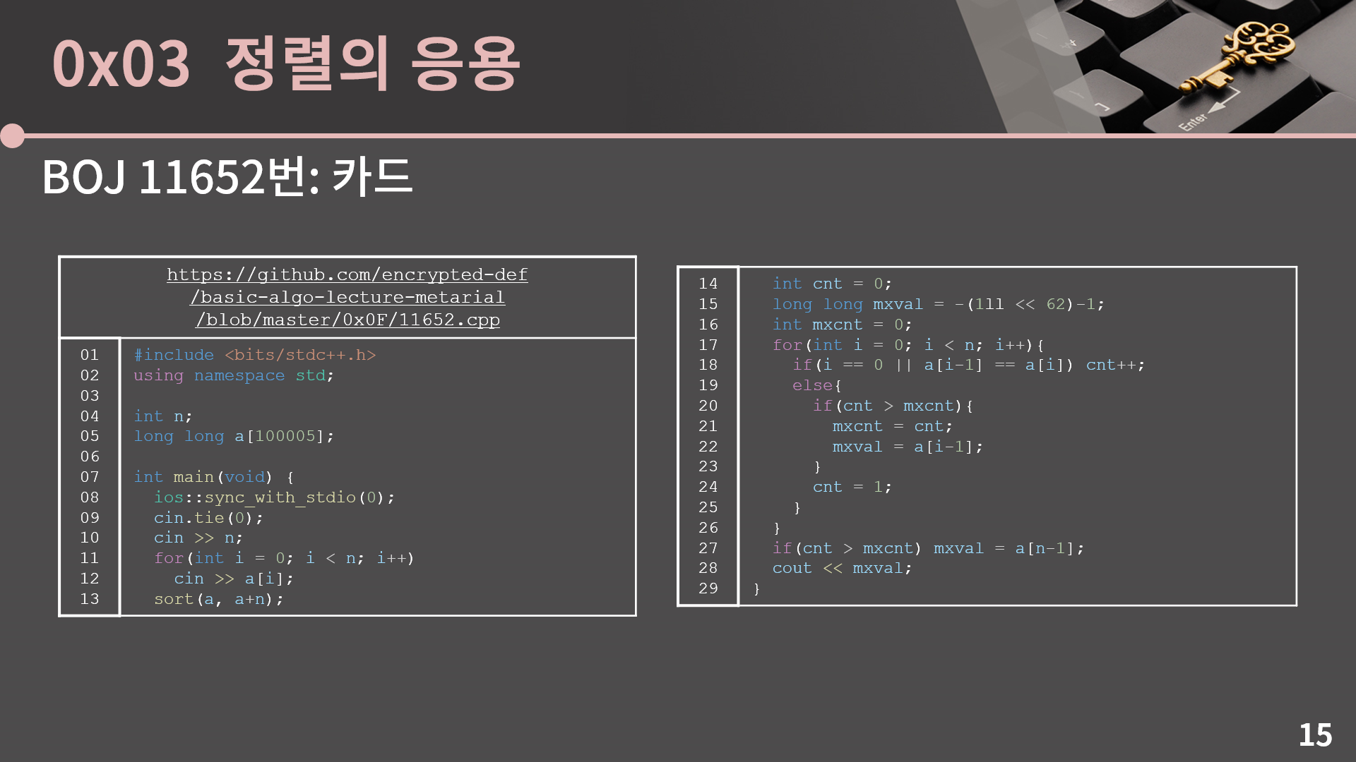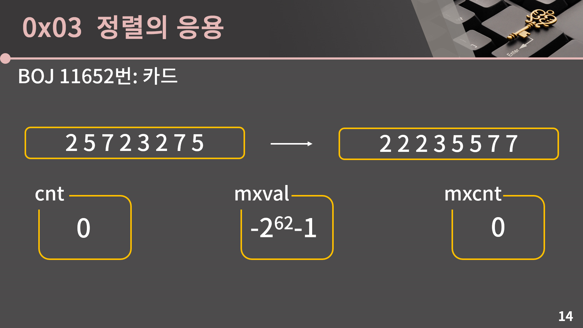 정렬에 대해 다룰건 다 다뤘고 마지막으로 정렬을 써먹을 수 있는 문제를 소개하겠습니다. 단순히 답을 오름차순으로 출력하라는 것과 같이 직관적으로 정렬이 필요함을 알 수 있는 문제 말고 정렬을 이용해서 시간복잡도를 개선할 수 있는 문제를 같이 보겠습니다. BOJ 11652번: 카드 문제를 확인해주세요.