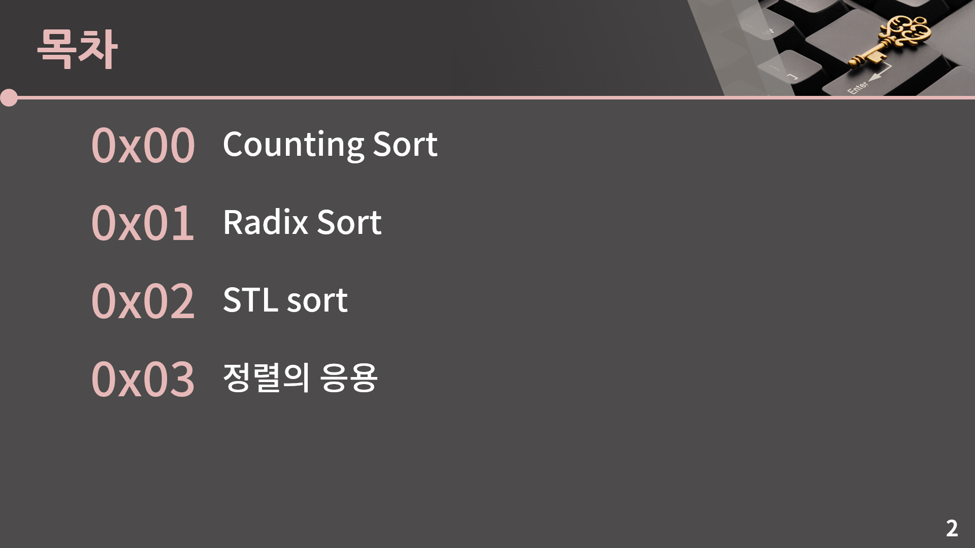 안녕하세요, 정렬 두 번째 시간입니다. 첫 시간에는 머지 소트와 퀵 소트를 배웠고 이번에는 카운팅 소트랑 라딕스 소트를 배울 예정입니다. 아마 전 시간보다는 더 쉬울거라 걱정을 조금 덜어내시고 들으면 될 것 같습니다.